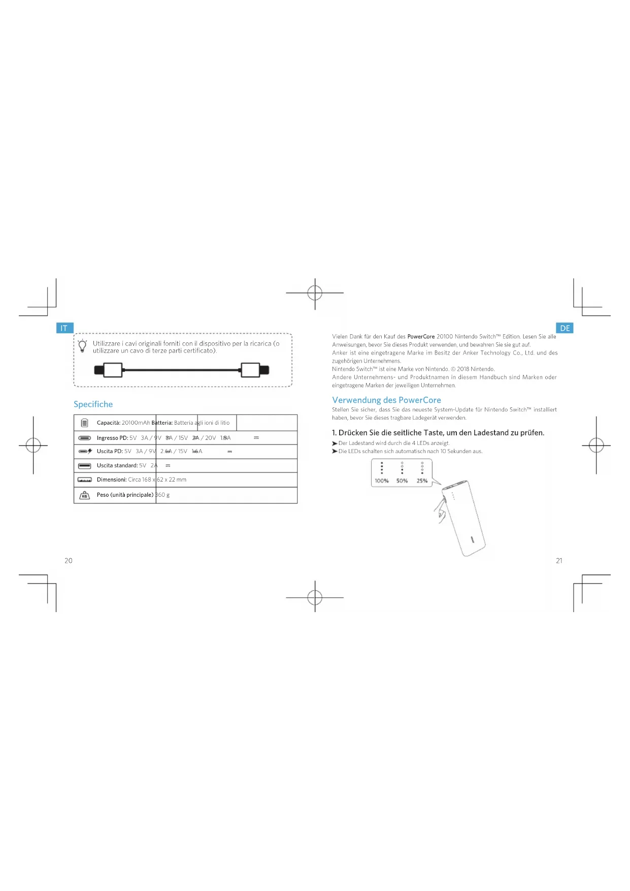 BEDIENUNGSANLEITUNG PowerCore 20100 PD Nintendo Switch Anker