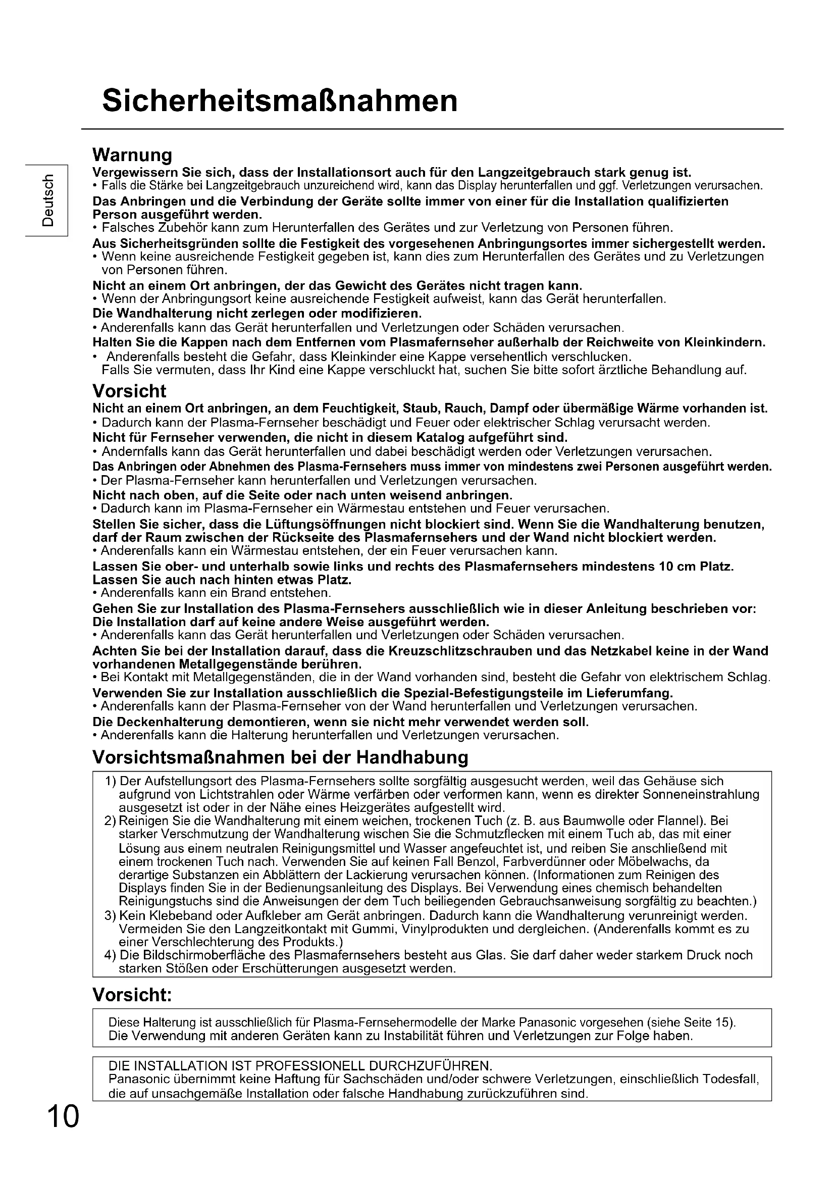 - Only a professional should remove the plasma TV from the wall- hanging bracket.10 Deutsch Sicherheitsmaßnahmen Warnung Vergewissern Sie sich, dass der Installationsort auch für den Langzeitgebrauch stark genug ist.