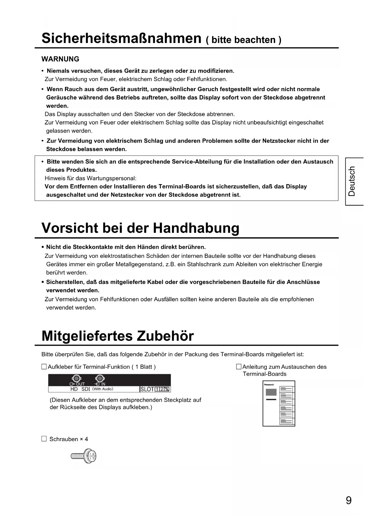 - Similarly, audio signal output will be suspended if a channel which is not one of the multiple channels among the SDI signals has been selected. 0 dBFS-20 dBFS (0 dB)9 Deutsch Sicherheitsmaßnahmen ( bitte beachten ) Mitgeliefertes Zubehör Bitte überprüfen Sie, daß das folgende Zubehör in der Packung des Terminal-Boards mitgeliefert ist: Vorsicht bei der Handhabung WARNUNG