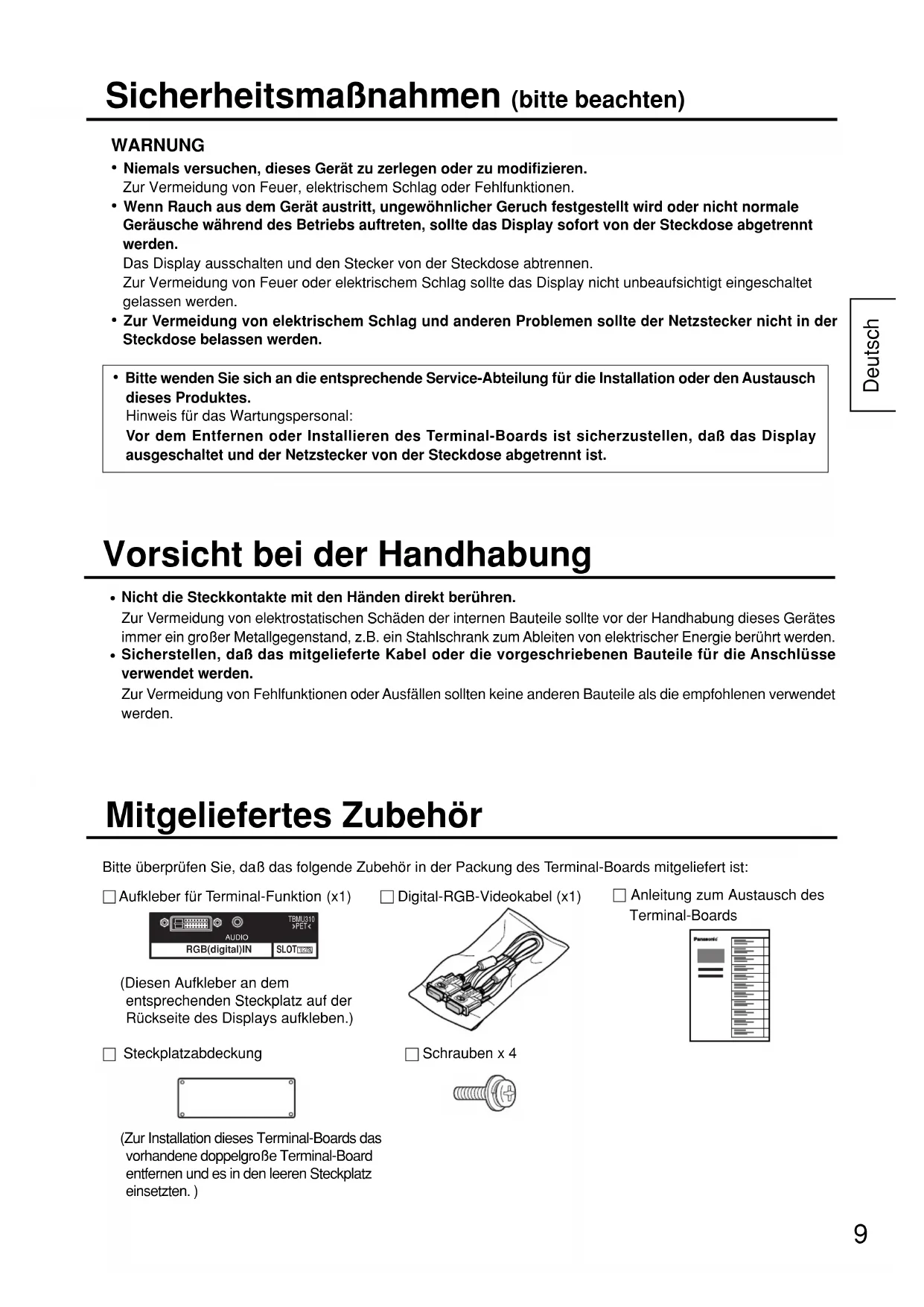 - Bitte wenden Sie sich an die entsprechende Service-Abteilung für die Installation oder den Austausch dieses Produktes.Hinweis für das Wartungspersonal: Vor dem Entfernen oder Installieren des Terminal-Boards ist sicherzustellen, daß das Display ausgeschaltet und der Netzstecker von der Steckdose abgetrennt ist. WARNUNG