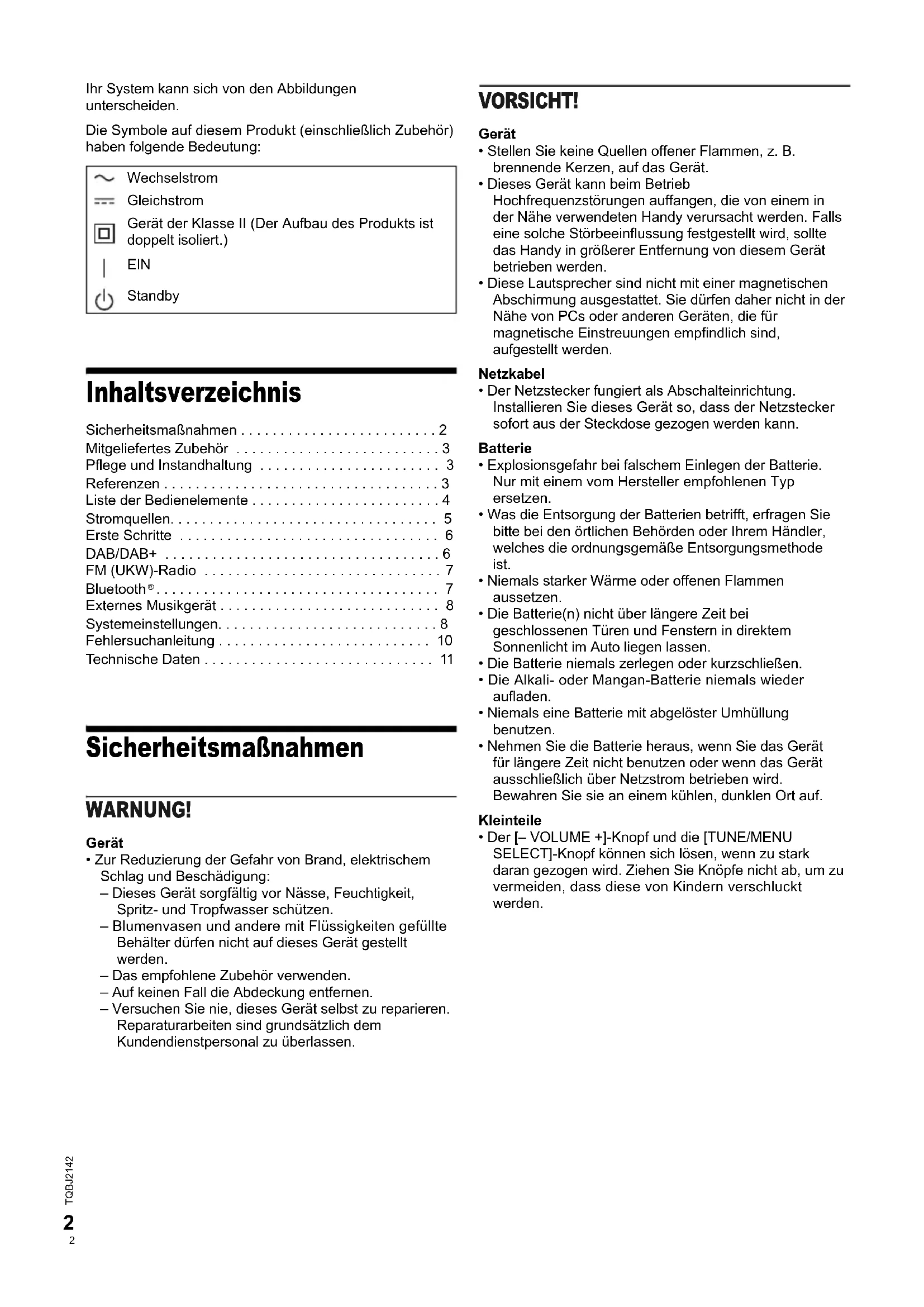 - Der [‒ VOLUME +]-Knopf und die [TUNE/MENU SELECT]-Knopf können sich lösen, wenn zu stark daran gezogen wird. Ziehen Sie Knöpfe nicht ab, um zu vermeiden, dass diese von Kindern verschluckt werden. Wechselstrom Gleichstrom Gerät der Klasse II (Der Aufbau des Produkts ist doppelt isoliert.) EIN Standby D100BT_TQBJ2142.book Page 2 Monday, May 7, 2018 12:02 PM offset printing3 TQBJ2142 Konformitätserklärung (DoC)Hiermit erklärt „Panasonic Corporation“, dass dieses Produkt den grundlegenden Anforderungen sowie den anderen relevanten Vorschriften der Richtlinie 2014/53/EU entspricht.Kunden können eine Kopie der Original-Konformitätserklärung zu unseren RE-Produkten von unserem KE-Server herunterladen:http://www.ptc.panasonic.euKontaktadresse des zugelassenen Vertragsbüros:Panasonic Marketing Europe GmbH, Panasonic Testing Centre, Winsbergring 15, 22525 Hamburg, Deutschland Mitgeliefertes Zubehör Kontrollieren Sie bitte das mitgelieferte Zubehör. 1 AC-Adapter Pflege und Instandhaltung Trennen Sie vor der Wartung das Netzkabel vom Netz. Reinigen Sie dieses System mit einem weichen, trockenen Tuch.• Verwenden Sie zum Reinigen dieser Anlage auf keinen Fall Alkohol, Farbverdünner oder Benzin.• Vor Gebrauch eines chemisch behandelten Reinigungstuchs lesen Sie bitte die dem Tuch beiliegende Gebrauchsanweisung. Referenzen Lizenzen Bluetooth
