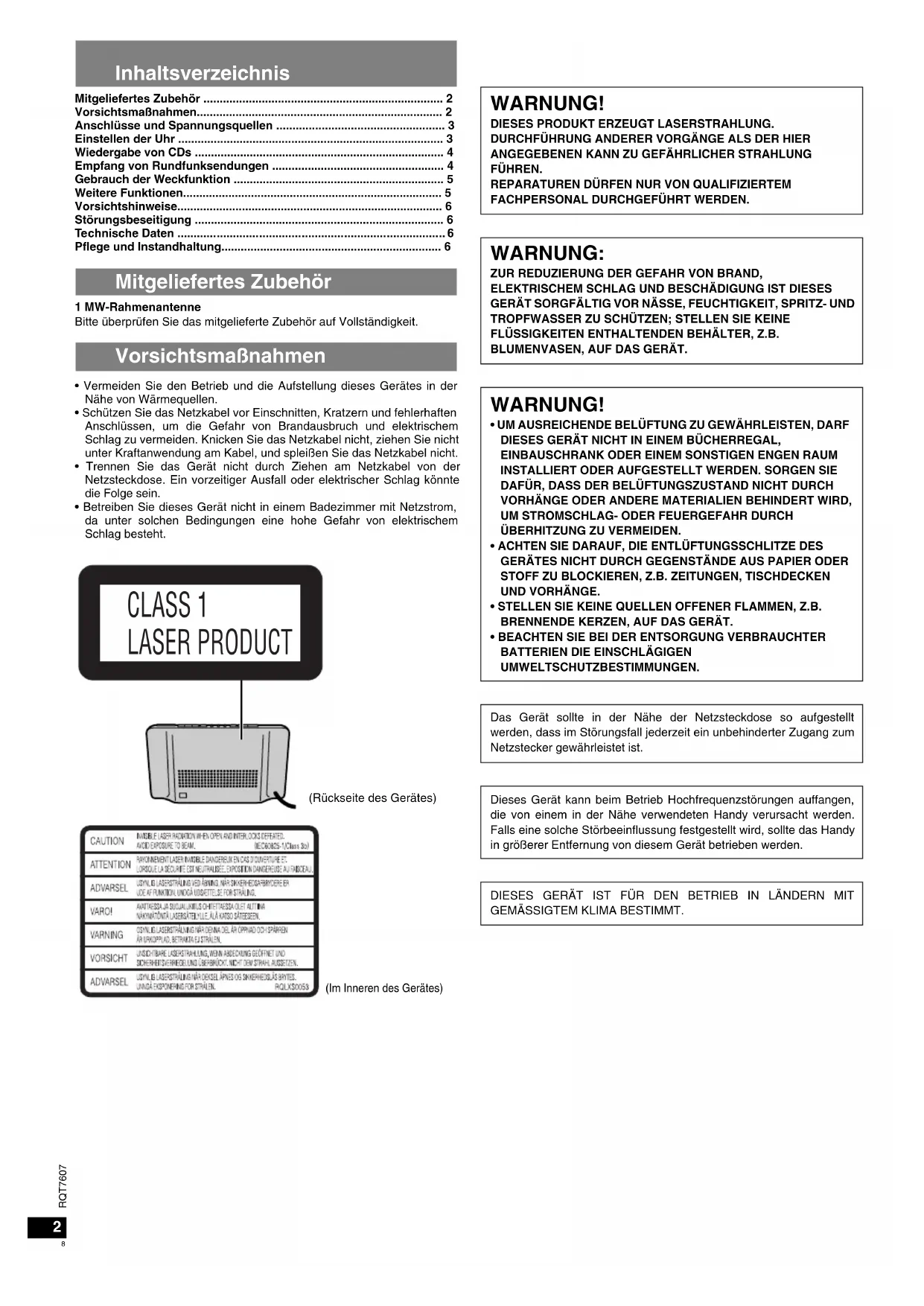 UMWELTSCHUTZBESTIMMUNGEN. Das Gerät sollte in der Nähe der Netzsteckdose so aufgestellt werden, dass im Störungsfall jederzeit ein unbehinderter Zugang zum Netzstecker gewährleistet ist. Dieses Gerät kann beim Betrieb Hochfrequenzstörungen auffangen, die von einem in der Nähe verwendeten Handy verursacht werden. Falls eine solche Störbeeinflussung festgestellt wird, sollte das Handy in größerer Entfernung von diesem Gerät betrieben werden. DIESES GERÄT IST FÜR DEN BETRIEB IN LÄNDERN MIT GEMÄSSIGTEM KLIMA BESTIMMT. 2DEUTSCH RQT7607