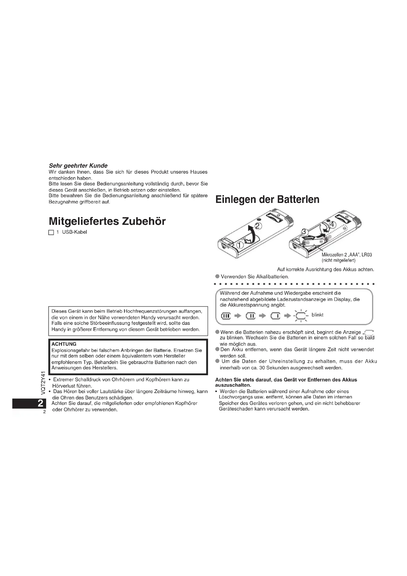 - Werden die Batterien während einer Aufnahme oder eines Löschvorgangs usw. entfern, können alle Daten im internen Speicher des Gerätes verloren geben, und ein nicht behebbarer Geräteschaden kann versursucht werden.