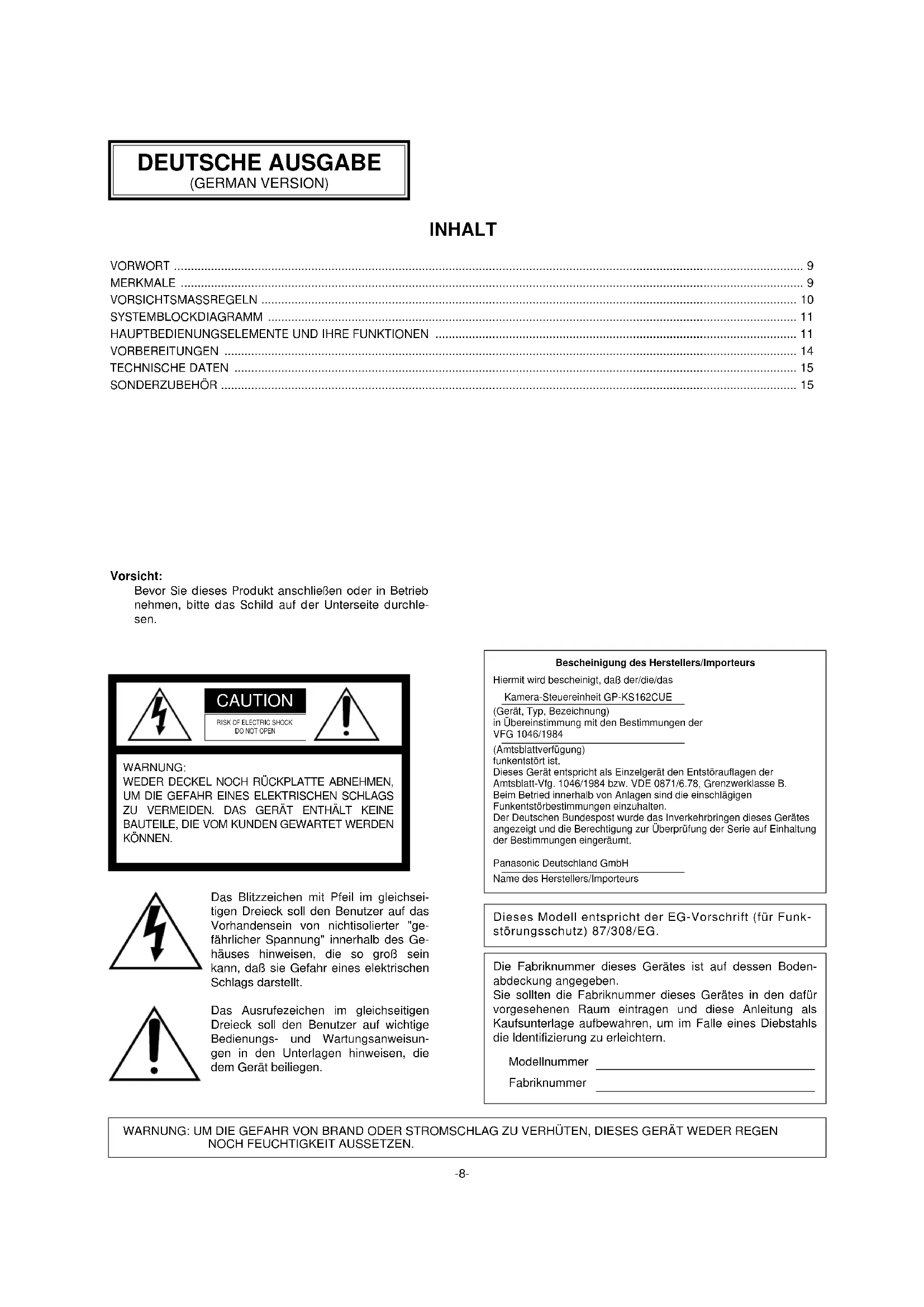 Die Fabriknummer dieses Gerätes ist auf dessen Boden- abdeckung angegeben. Sie sollten die Fabriknummer dieses Gerätes in den dafür vorgesehenen Raum eintragen und diese Anleitung als Kaufsunterlage aufbewahren, um im Falle eines Diebstahls die ldentifizierung zu erleichtern. Modellnummer Fabriknummer Bescheinigung des Herstellers/ImporteursHiermit wird bescheinigt, daß der/die/dasKamera-Steuereinheit GP-KS162CUE(Gerät, Typ, Bezeichnung)in Übereinstimmung mit den Bestimmungen derVFG 1046/1984(Amtsblattverfügung)funkentstört ist.Dieses Gerät entspricht als Einzelgerät den Entstörauflagen derAmtsblatt-Vfg. 1046/1984 bzw. VDE 0871/6.78, Grenzwerklasse B.Beim Betried innerhalb von Anlagen sind die einschlägigenFunkentstörbestimmungen einzuhalten.Der Deutschen Bundespost wurde das Inverkehrbringen dieses Gerätesangezeigt und die Berechtigung zur Überprüfung der Serie auf Einhaltungder Bestimmungen eingeräumt.Panasonic Deutschland GmbHName des Herstellers/Importeurs Dieses Modell entspricht der EG-Vorschrift (für Funk- störungsschutz) 87/308/EG.-9- VORWORT Die Panasonic Kamera-Steuereinheit GP-KS162CU ist für die Verwendung mit dem optionalen Kamerakopf GP- KS162H ausgelegt. Dieses System löst Raumprobleme, die bei vielen Video- Anwendungen anzutreffen sind. Mit einem Gewicht von nur 16 g mißt diese extrem kompakte CCTV-Kamera nur etwa 17 mm im Durchmesser und weniger als 50 mm in der Länge. Die GP-KS162CU Kamera-Steuereinheit (CCU) und der optionale Kamerakopf GP-KS162H können bis zu einer Entfernung von 10 m voneinander angeordnet werden, indem ein optionales 10 m Kabel verwendet wird. Die außergewöhnliche GP-KS162 Serie läßt damit vielseitige Kamerawinkel und Aufnahmen zu, wie sie früher nur sehr schwer zu erzielen waren. Das 1/2-Zoll-CCD-Aufnahmeele- ment weist 440.000 Bildpunkte und eine horizontale Auflösung von mehr als 480 Zeilen auf, wobei der Signal- Rauschabstand 50 dB beträgt. Ein automatischer Licht- kontrollschalter läßt klare und hochwertige Farbbilder auch bei einer Beleuchtung von nur 3 Lux bei F1,4 zu. Zusätzlich ermöglicht ein von Matsushita etwickeltes Weit- winkelobjektiv mit kleinem Durchmesser Nahaufnahmen in einem Abstand von nur etwa 20 mm mit hoher Auflösung. Farbänderungen werden von einem Mikrocomputer in der Steuereinheit GP-KS162CU sofort festgestellt und kompen- siert. Der richtige Weißabgleich wird durch einen einge- bauten Schaltkreis für automatischen Abtast-Weißabgleich (ATW) sichergestellt. Der Weißabgleich und die R- und B- Farben können auch manuell eingestellt werden, um opti- male Farbreproduktion sicherzustellen. Der Kamerakopf kann mit den meisten bestehenden Kamerasystemen und VTRs, Video-Drucker oder Disketten- Recorder verwendet werden, um vielseitige neue und tradi- tionelle Anwendungsarten sicherzustellen. MERKMALE (mit GP-KS162H)