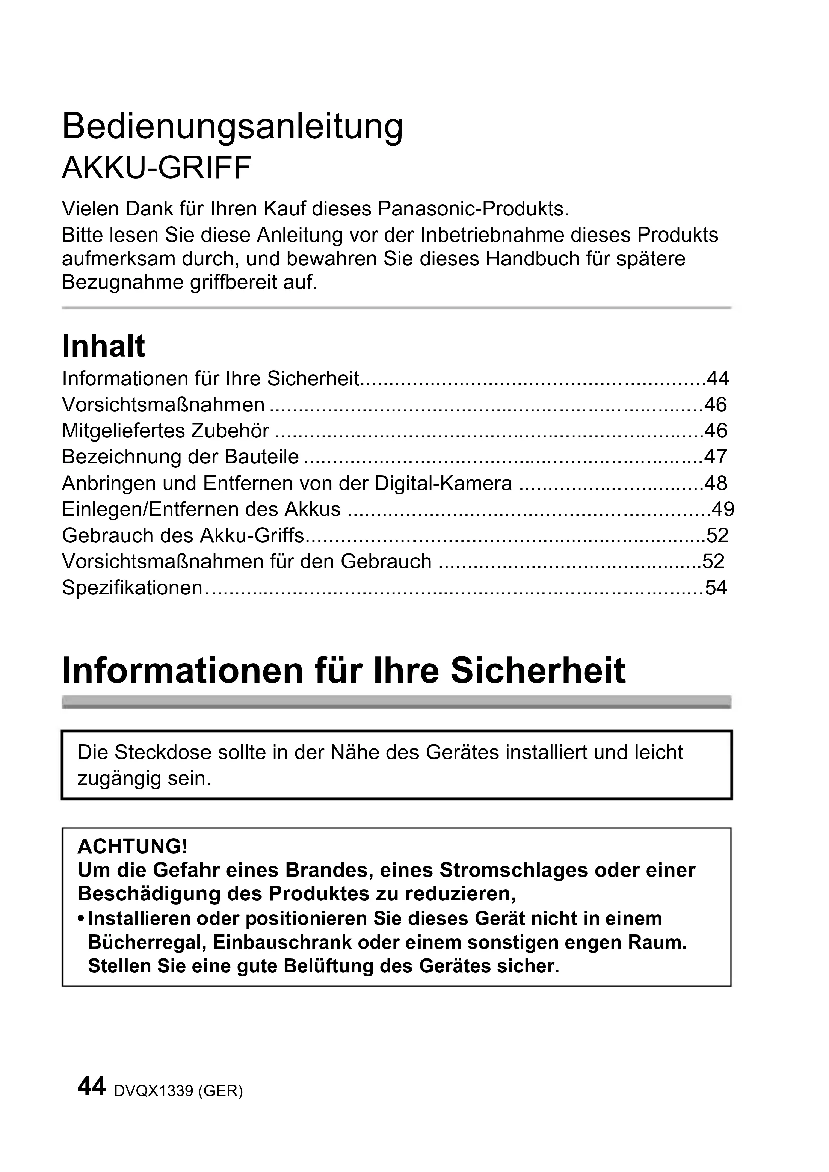 - Bedienungsanleitung AKKU-GRIFF Vielen Dank für Ihren Kauf dieses Panasonic-Produkts. Bitte lesen Sie diese Anleitung vor der Inbetriebnahme dieses Produkts aufmerksam durch, und bewahren Sie dieses Handbuch für spätere Bezugnahme griffbereit auf. Inhalt Informationen für Ihre Sicherheit p. 44