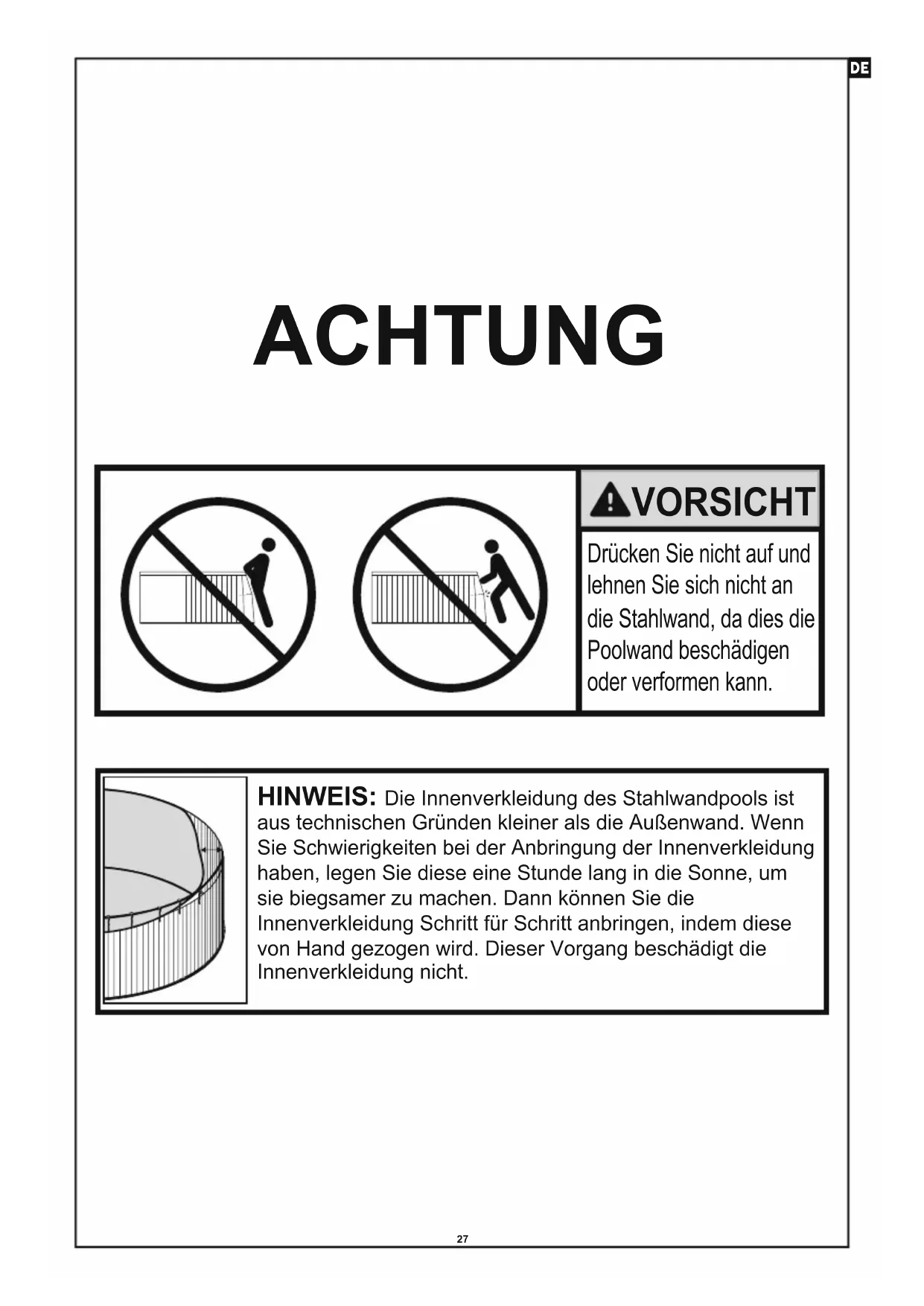 10 cm #04 #0827 Drücken Sie nicht auf und lehnen Sie sich nicht an die Stahlwand, da dies die Poolwand beschädigen oder verformen kann. HINWEIS: Die Innenverkleidung des Stahlwandpools ist aus technischen Gründen kleiner als die Außenwand. Wenn Sie Schwierigkeiten bei der Anbringung der Innenverkleidung haben, legen Sie diese eine Stunde lang in die Sonne, um sie biegsamer zu machen. Dann können Sie die Innenverkleidung Schritt für Schritt anbringen, indem diese von Hand gezogen wird. Dieser Vorgang beschädigt die Innenverkleidung nicht. ACHTUNG VORSICHT DE28