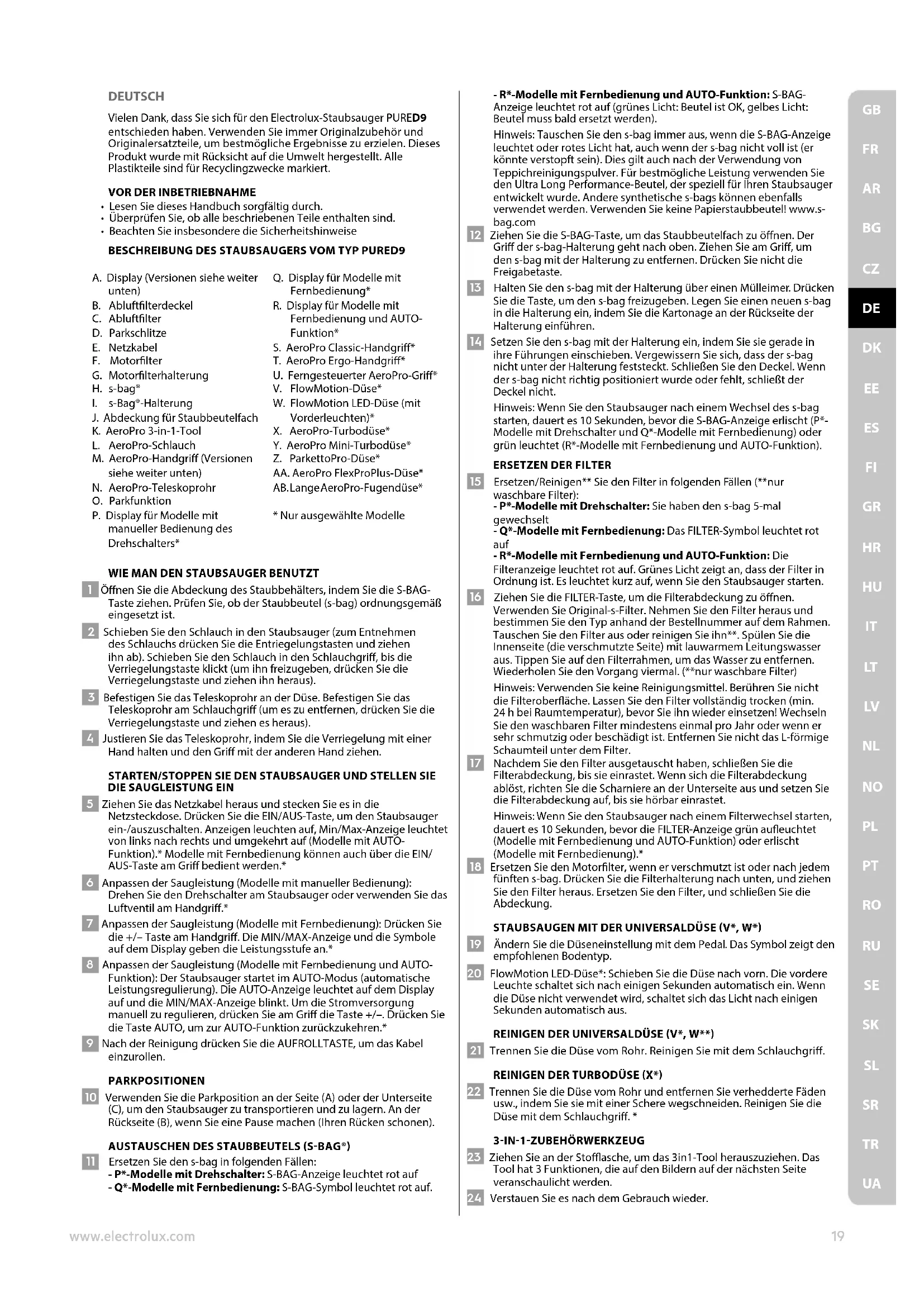 J. Abdeckung für Staubbeutelfach K. AeroPro 3-in-1-Tool L. AeroPro-Schlauch M. AeroPro-Handgri (Versionen siehe weiter unten) N. AeroPro-Teleskoprohr O. Parkfunktion P. Display für Modelle mit manueller Bedienung des Drehschalters* Q. Display für Modelle mit Fernbedienung* R. Display für Modelle mit Fernbedienung und AUTO- Funktion* S. AeroPro Classic-Handgri* T. AeroPro Ergo-Handgri* U. Ferngesteuerter AeroPro-Gri*