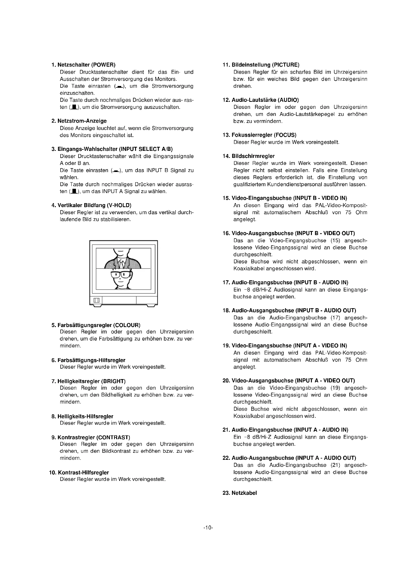 - Bei der Verwendung des Monitors immer die zulässige Temperatur, Feuchtigkeit und Stromquelle einhalten. Den Monitor nur im Temperaturbereich −10°C bis +50°C und bei einer Luftfeuchtigkeit von weniger als 90% verwenden. Die Stromversorgung muß 220 bis 240 V Wechsel- strom, 50 Hz, betragen.-9- Video Monitor WV-CM