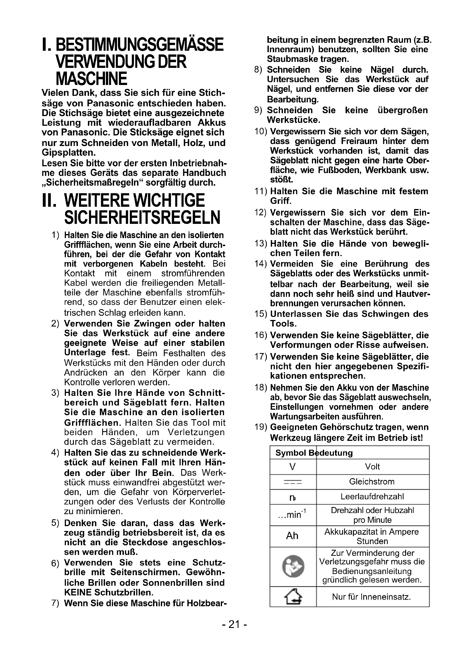 BESTIMMUNGSGEMÄSSE VERWENDUNG DER MASCHINE Vielen Dank, dass Sie sich für eine Stich- säge von Panasonic entschieden haben. Die Stichsäge bietet eine ausgezeichnete Leistung mit wiederaufladbaren Akkus von Panasonic. Die Sticksäge eignet sich nur zum Schneiden von Metall, Holz, und Gipsplatten. Lesen Sie bitte vor der ersten Inbetriebnah- me dieses Geräts das separate Handbuch „Sicherheitsmaßregeln“ sorgfältig durch. II. WEITERE WICHTIGE SICHERHEITSREGELN