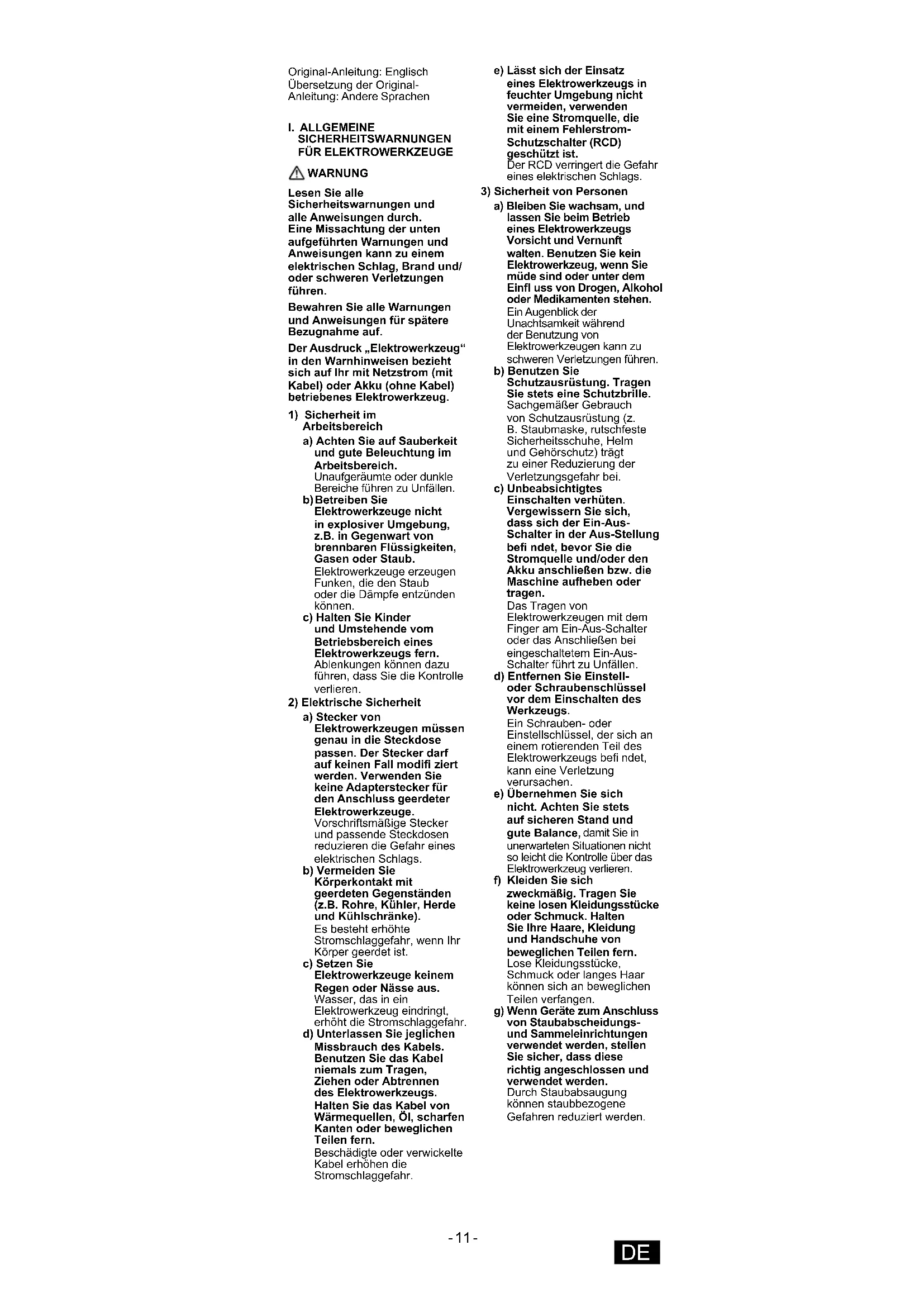 WARNUNG Lesen Sie alle Sicherheitswarnungen und alle Anweisungen durch. Eine Missachtung der unten aufgeführten Warnungen und Anweisungen kann zu einem elektrischen Schlag, Brand und/ oder schweren Verletzungen führen. Bewahren Sie alle Warnungen und Anweisungen für spätere Bezugnahme auf. Der Ausdruck „Elektrowerkzeug“ in den Warnhinweisen bezieht sich auf Ihr mit Netzstrom (mit Kabel) oder Akku (ohne Kabel) betriebenes Elektrowerkzeug.