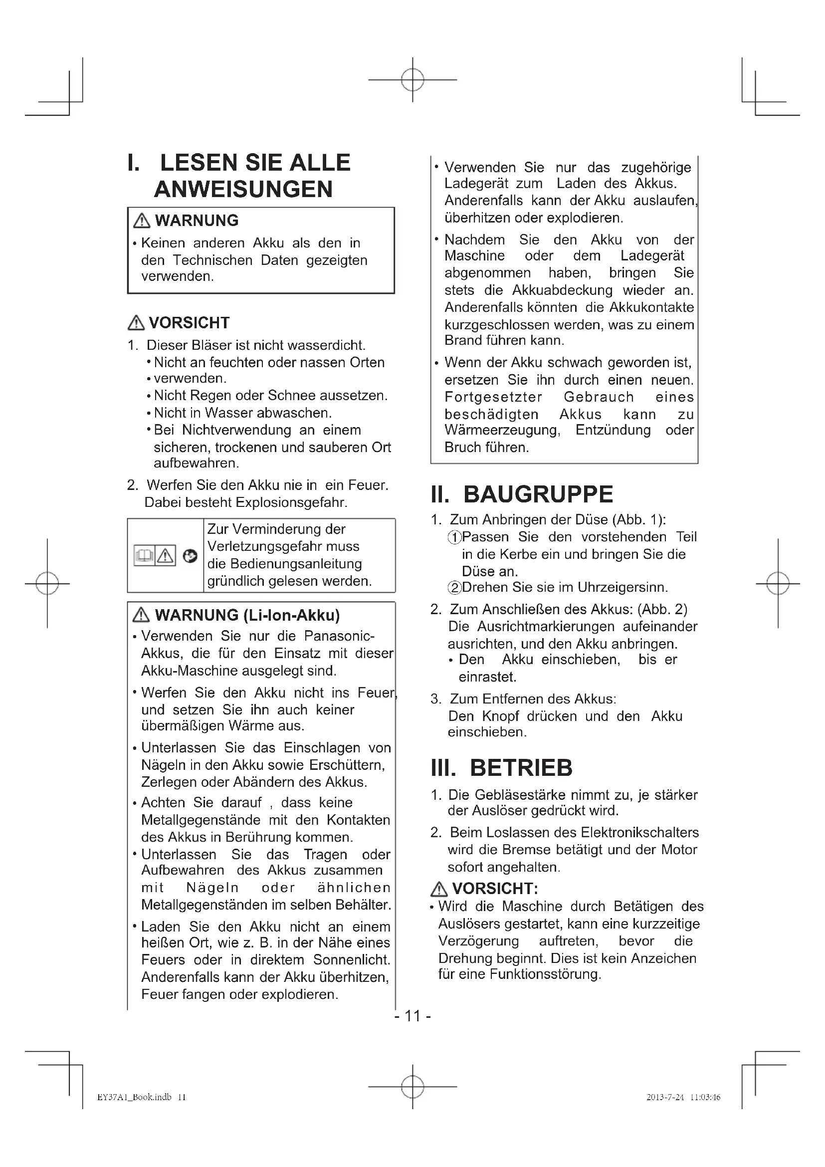Auslösers gestartet, kann eine kurzzeitige Verzögerung auftreten, bevor die Drehung beginnt. Dies ist kein Anzeichen für eine Funktionsstörung. EY37A1_Book.indb 11 2013-7-24 11:03:46- 12 - [Akku] Für richtigen Gebrauch des Akkus Um eine möglichst lange Lebensdauer