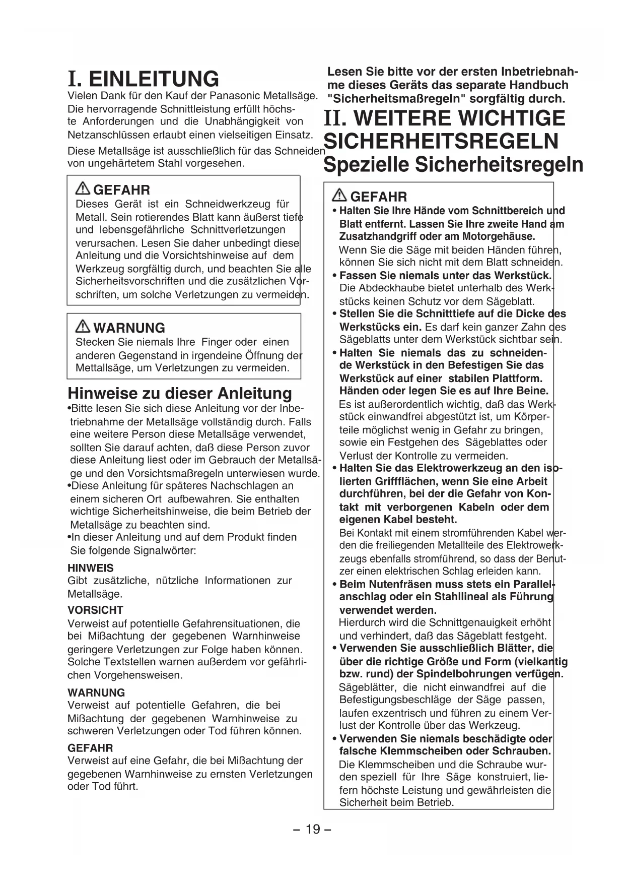 I.EINLEITUNG Vielen Dank für den Kauf der Panasonic Metallsäge. Die hervorragende Schnittleistung erfüllt höchs-te Anforderungen und die Unabhängigkeit von Netzanschlüssen erlaubt einen vielseitigen Einsatz.Diese Metallsäge ist ausschließlich für das Schneiden von ungehärtetem Stahl vorgesehen. GEFAHR Dieses Gerät ist ein Schneidwerkzeug für Metall. Sein rotierendes Blatt kann äußerst tiefe und lebensgefährliche Schnittverletzungen verursachen. Lesen Sie daher unbedingt diese Anleitung und die Vorsichtshinweise auf dem Werkzeug sorgfältig durch, und beachten Sie alle Sicherheitsvorschriften und die zusätzlichen Vor-schriften, um solche Verletzungen zu vermeiden. WARNUNG Stecken Sie niemals Ihre Finger oder einen anderen Gegenstand in irgendeine Öffnung der Mettallsäge, um Verletzungen zu vermeiden. Hinweise zu dieser Anleitung