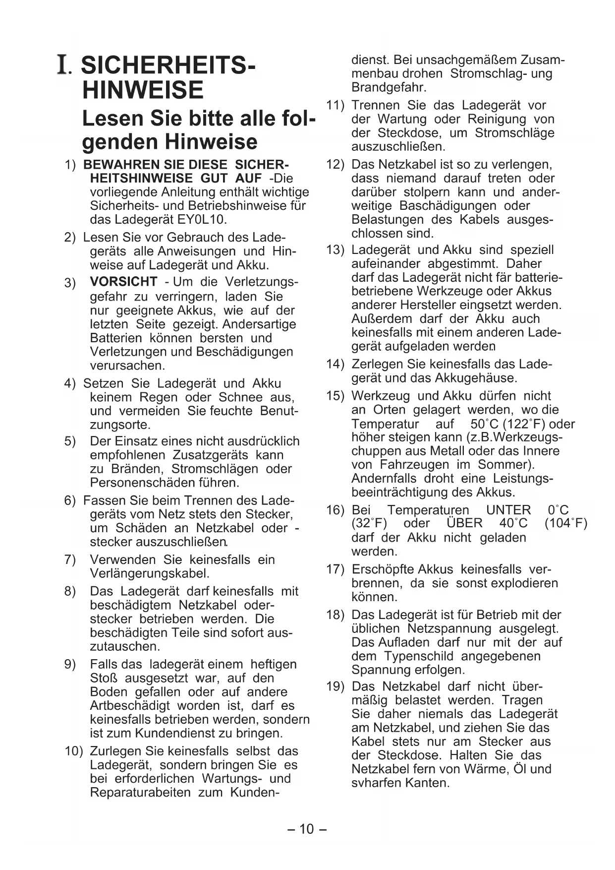 HEITSHINWEISE GUT AUF -Die vorliegende Anleitung enthält wichtige Sicherheits- und Betriebshinweise für das Ladegerät EY0L10.