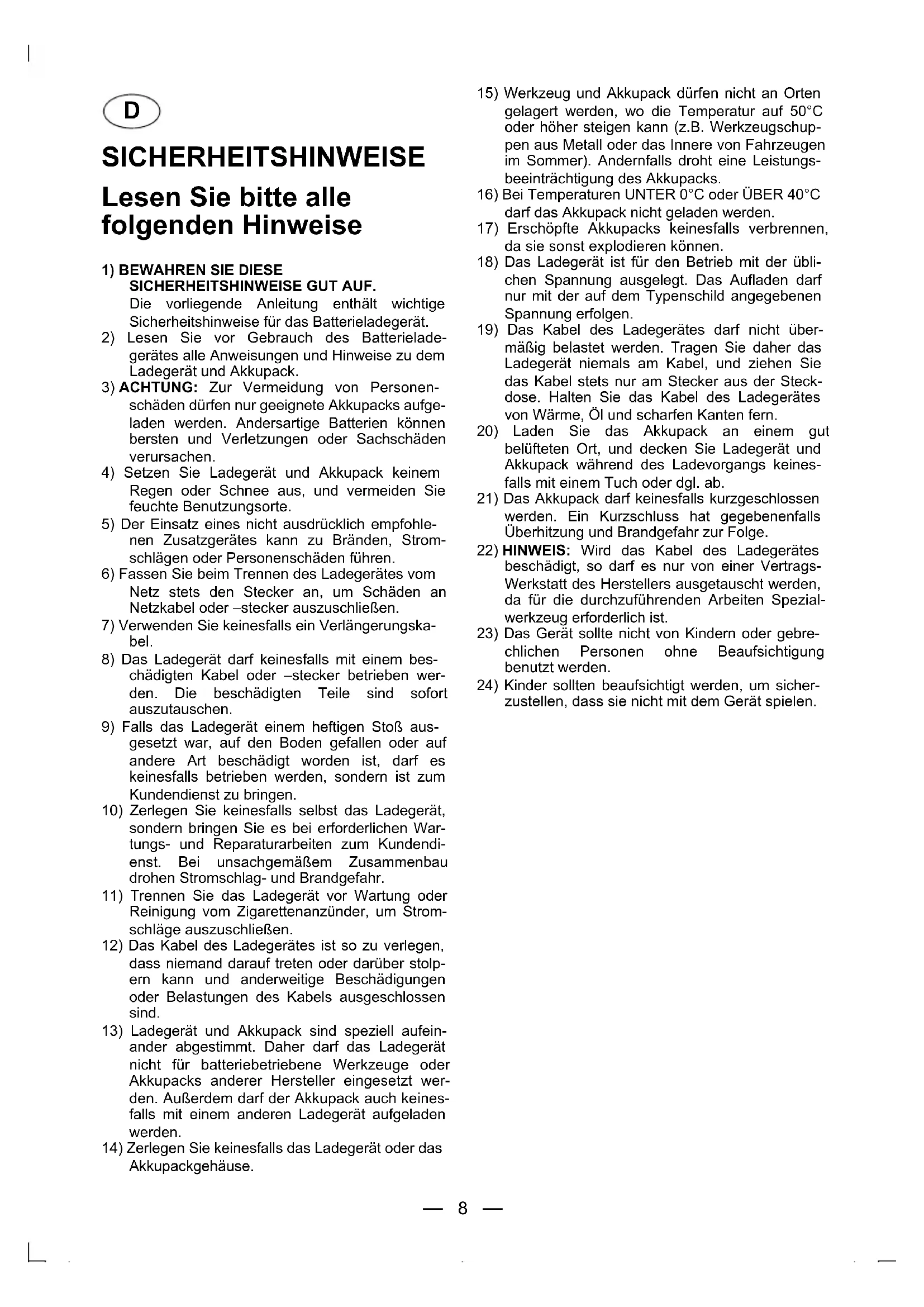 8) Das Ladegerät darf keinesfalls mit einem bes-
