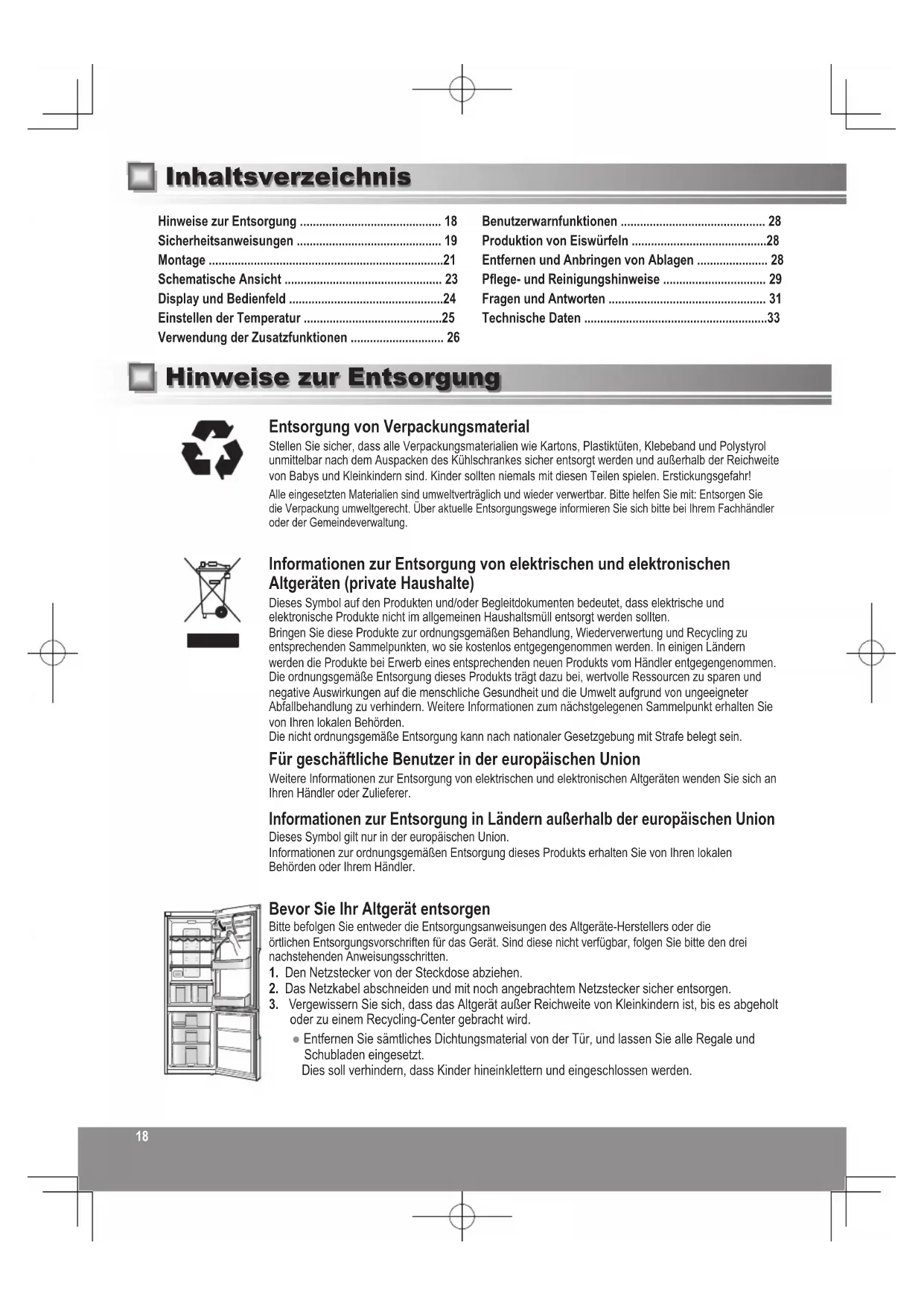 - oder zu einem Recycling-Center gebracht wird. ● Entfernen Sie sämtliches Dichtungsmaterial von der Tür, und lassen Sie alle Regale und Schubladen eingesetzt. Dies soll verhindern, dass Kinder hineinklettern und eingeschlossen werden. Hinweise zur Entsorgung Inhaltsverzeichnis Hinweise zur Entsorgung p. 18