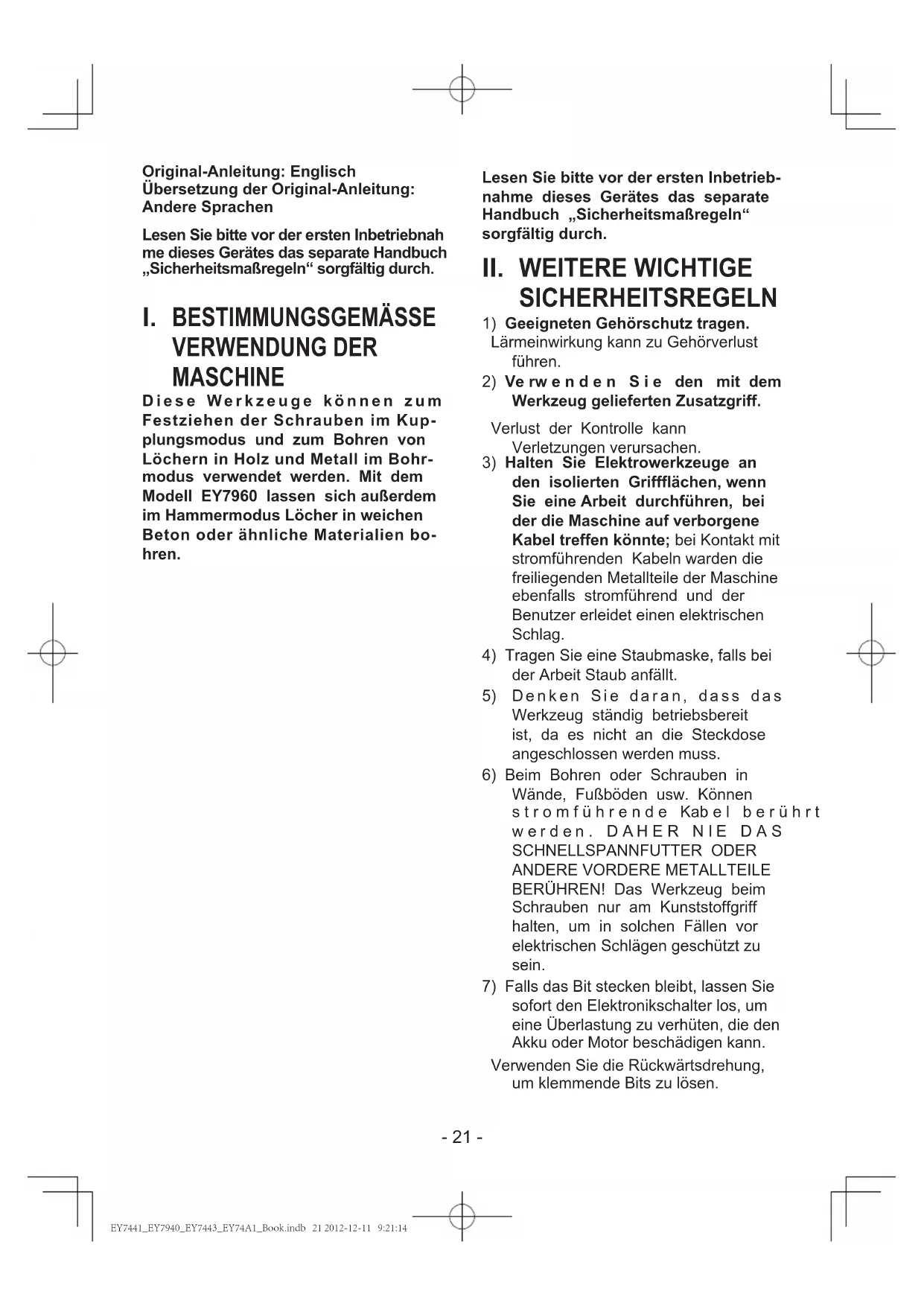 sofort den Elektronikschalter los, um eine Überlastung zu verhüten, die den Akku oder Motor beschädigen kann. Verwenden Sie die Rückwärtsdrehung, um klemmende Bits zu lösen. Original-Anleitung: Englisch Übersetzung der Original-Anleitung: Andere Sprachen Lesen Sie bitte vor der ersten Inbetriebnah me dieses Gerätes das separate Handbuch „Sicherheitsmaßregeln“ sorgfältig durch. EY7441_EY7940_EY7443_EY74A1_Book.indb 21 2012-12-11 9:21:14- 22 -