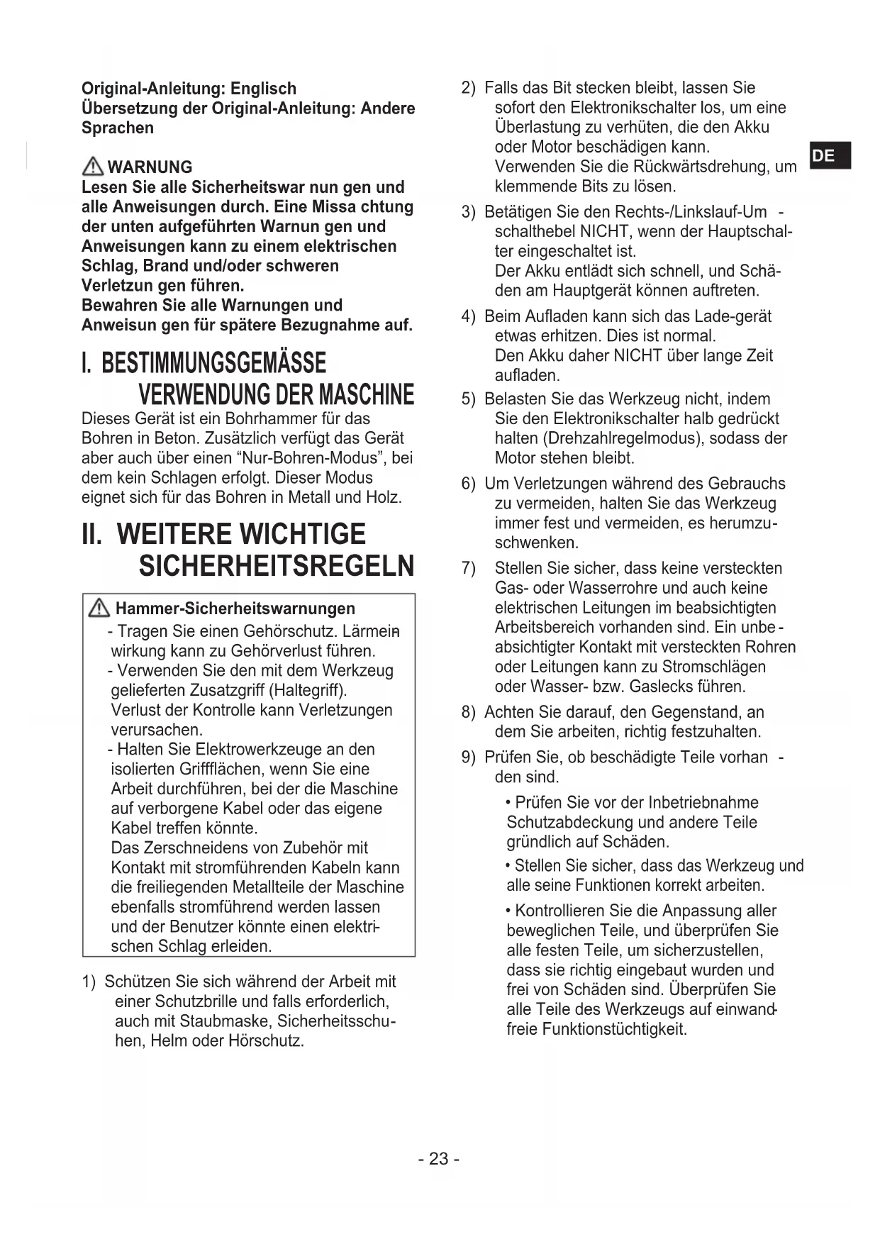 wirkung kann zu Gehörverlust führen. - Verwenden Sie den mit dem Werkzeug gelieferten Zusatzgriff (Haltegriff). Verlust der Kontrolle kann Verletzungen verursachen. - Halten Sie Elektrowerkzeuge an den isolierten Griffächen, wenn Sie eine Arbeit durchführen, bei der die Maschine auf verborgene Kabel oder das eigene Kabel treffen könnte. Das Zerschneidens von Zubehör mit Kontakt mit stromführenden Kabeln kann die freiliegenden Metallteile der Maschine ebenfalls stromführend werden lassen und der Benutzer könnte einen elektri