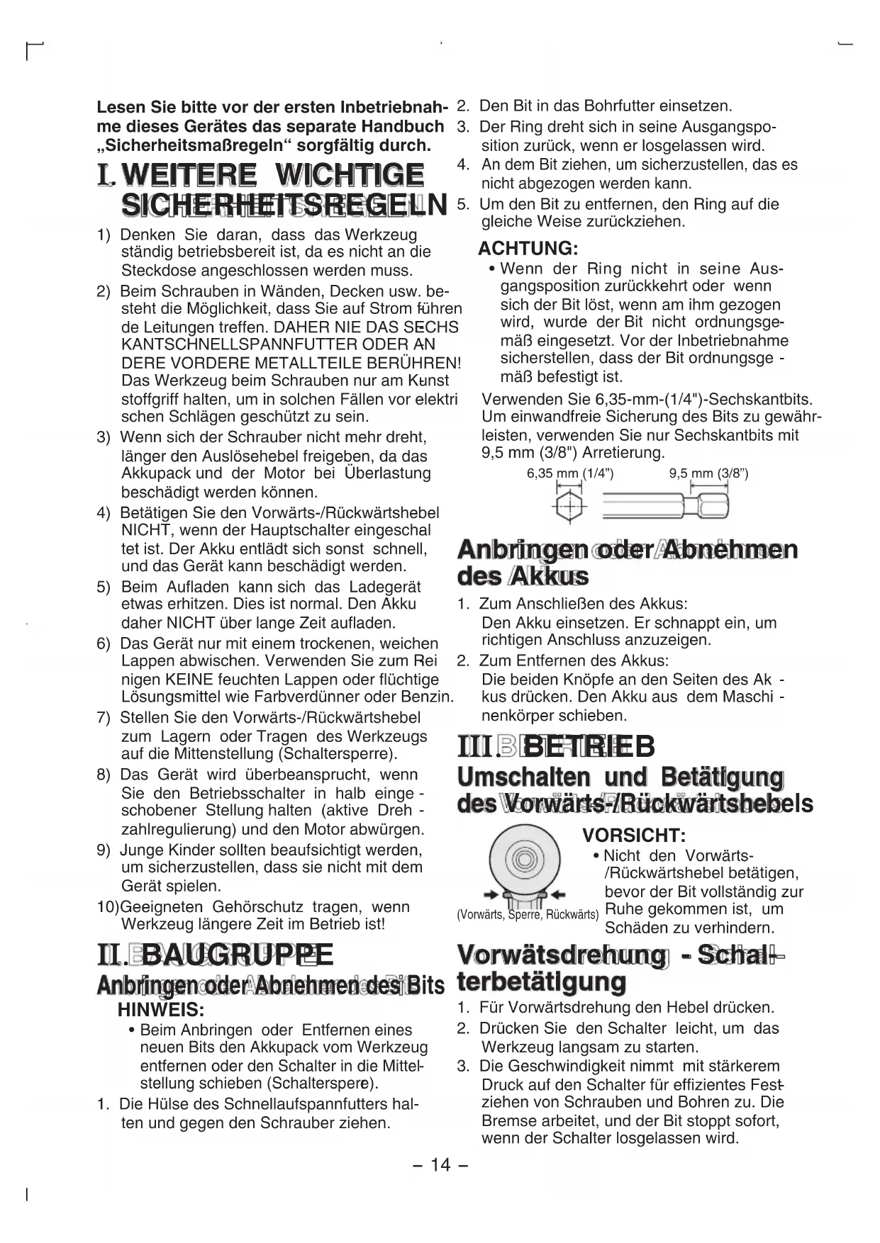 Beim Anbringen oder Entfernen eines neuen Bits den Akkupack vom Werkzeug entfernen oder den Schalter in die Mittel stellung schieben (Schaltersperr e). 1. Die Hülse des Schnellaufspannfutters hal-ten und gegen den Schrauber ziehen.2. Den Bit in das Bohrfutter einsetzen.3. Der Ring dreht sich in seine Ausgangspo-sition zurück, wenn er losgelassen wird. An dem Bit ziehen, um sicherzustellen, das es nicht abgezogen werden kann.5. Um den Bit zu entfernen, den Ring auf die gleiche Weise zurückziehen. ACHTUNG:
