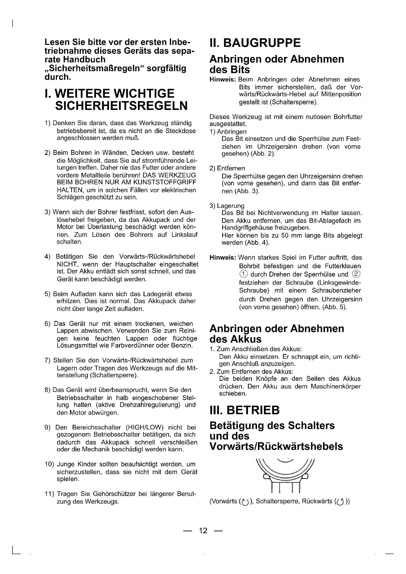 Hinweis: Beim Anbringen oder Abnehmer eines Bits immer sicherstellen, daß der Vorwärts/Rückwärts-Hebel auf Mittenposition gestellt ist (Schaltersperre).