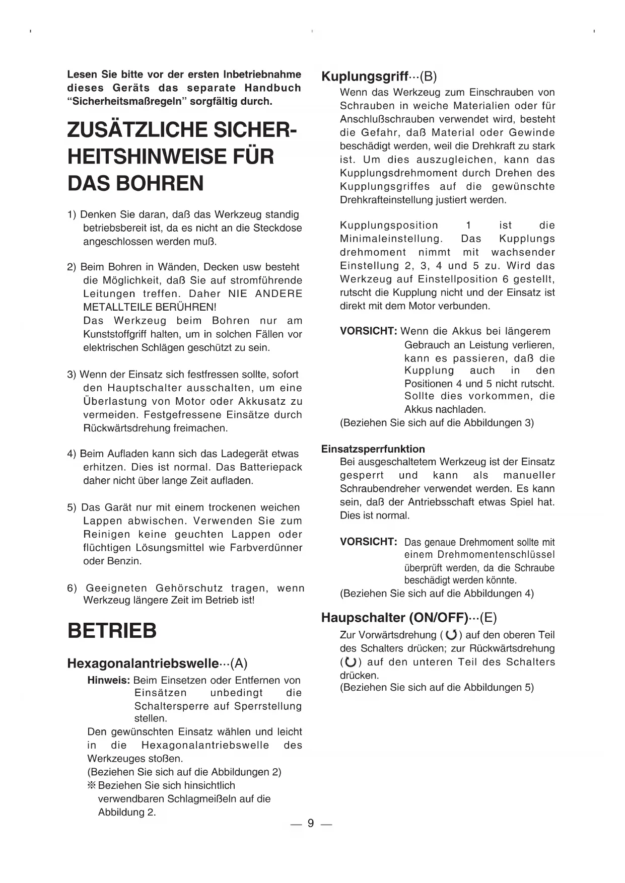 Beziehen Sie sich hinsichtlich verwendbaren Schlagmeißeln auf die Abbildung 2. Kuplungsgriff···(B) Wenn das Werkzeug zum Einschrauben von Schrauben in weiche Materialien oder für Anschlußschrauben verwendet wird, besteht die Gefahr, daß Material oder Gewinde beschädigt werden, weil die Drehkraft zu stark ist. Um dies auszugleichen, kann das Kupplungsdrehmoment durch Drehen des Kupplungsgriffes auf die gewünschte Drehkrafteinstellung justiert werden. Kupplungsposition 1 ist die Minimaleinstellung. Das Kupplungs drehmoment nimmt mit wachsender Einstellung 2, 3, 4 und 5 zu. Wird das Werkzeug auf Einstellposition 6 gestellt, rutscht die Kupplung nicht und der Einsatz ist direkt mit dem Motor verbunden. VORSICHT: Wenn die Akkus bei längerem Gebrauch an Leistung verlieren, kann es passieren, daß die Kupplung auch in den Positionen 4 und 5 nicht rutscht. Sollte dies vorkommen, die Akkus nachladen. (Beziehen Sie sich auf die Abbildungen 3) Einsatzsperrfunktion Bei ausgeschaltetem Werkzeug ist der Einsatz gesperrt und kann als manueller Schraubendreher verwendet werden. Es kann sein, daß der Antriebsschaft etwas Spiel hat. Dies ist normal. VORSICHT: Das genaue Drehmoment sollte mit einem Drehmomentenschlüssel überprüft werden, da die Schraube beschädigt werden könnte. (Beziehen Sie sich auf die Abbildungen 4) Haupschalter (ON/OFF)···(E) Zur Vorwärtsdrehung ( ) auf den oberen Teil des Schalters drücken; zur Rückwärtsdrehung ( ) auf den unteren Teil des Schalters drücken. (Beziehen Sie sich auf die Abbildungen 5) P09-11(6220GE)05.05.0210:18ページ910 Bereichsschalter···(C) Um den unterschiedlichen Anwendungswechen des Werkzeugs gerecht zu werden, sind zwei Drehgeschwindigkeiten wählbar. Je nach Verwendungszweck kann zwischen hoher und niedriger Geschwindigkeit gewählt werden. LOW HIGH 200min