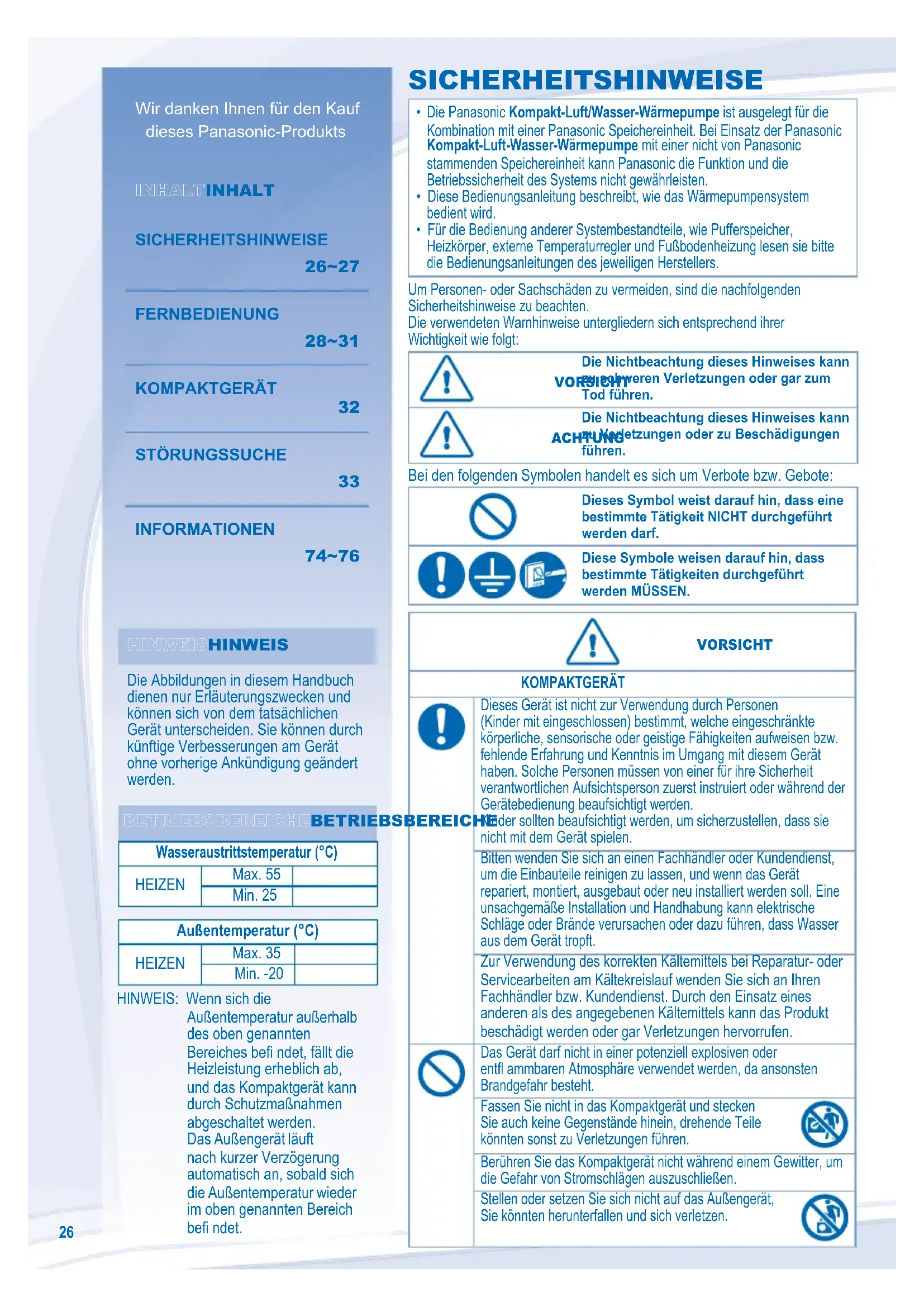- Für die Bedienung anderer Systembestandteile, wie Pufferspeicher, Heizkörper, externe Temperaturregler und Fußbodenheizung lesen sie bitte die Bedienungsanleitungen des jeweiligen Herstellers. SICHERHEITSHINWEISE Wir danken Ihnen für den Kauf dieses Panasonic-Produkts INHALTINHALT SICHERHEITSHINWEISE 26~27 FERNBEDIENUNG 28~31 KOMPAKTGERÄT