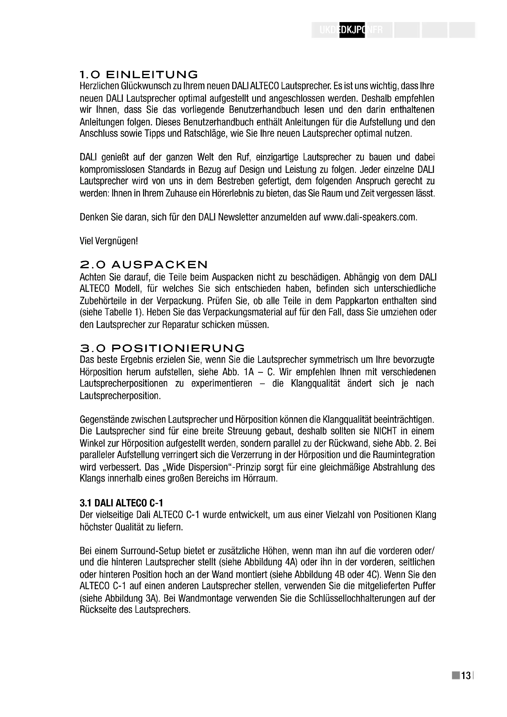 Herzlichen Glückwunsch zu Ihrem neuen DALI ALTECO Lautsprecher. Es ist uns wichtig, dass Ihre neuen DALI Lautsprecher optimal aufgestellt und angeschlossen werden. Deshalb empfehlen wir Ihnen, dass Sie das vorliegende Benutzerhandbuch lesen und den darin enthaltenen Anleitungen folgen. Dieses Benutzerhandbuch enthält Anleitungen für die Aufstellung und den Anschluss sowie Tipps und Ratschläge, wie Sie Ihre neuen Lautsprecher optimal nutzen. DALI genießt auf der ganzen Welt den Ruf, einzigartige Lautsprecher zu bauen und dabei kompromisslosen Standards in Bezug auf Design und Leistung zu folgen. Jeder einzelne DALI Lautsprecher wird von uns in dem Bestreben gefertigt, dem folgenden Anspruch gerecht zu werden: Ihnen in Ihrem Zuhause ein Hörerlebnis zu bieten, das Sie Raum und Zeit vergessen lässt. Denken Sie daran, sich für den DALI Newsletter anzumelden auf www.dali-speakers.com. Viel Vergnügen!