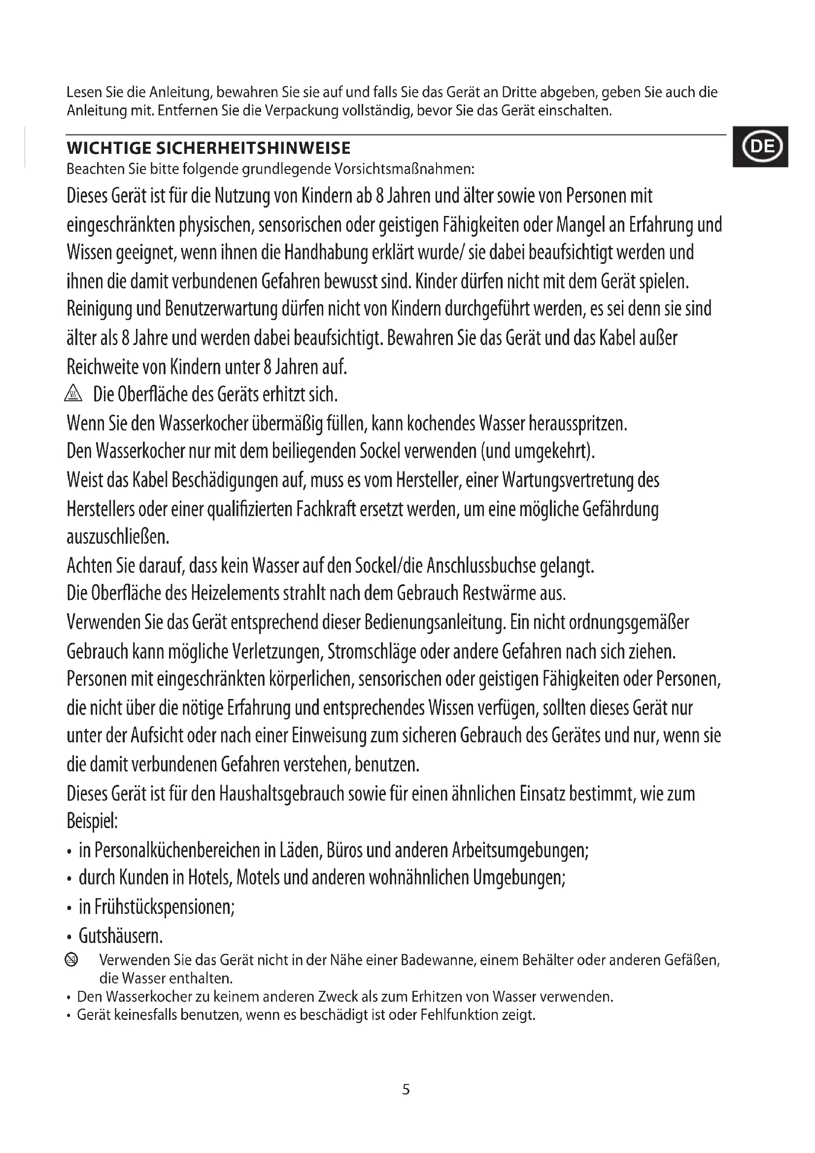 To avoid environmental and health problems due to hazardous substances, appliances and rechargeable and non-rechargeable batteries marked with one of these symbols must not be disposed of with unsorted municipal waste. Always dispose of electrical and electronic products and, where applicable, rechargeable and non-rechargeable batteries, at an appropriate ocial recycling/collection point.5 Lesen Sie die Anleitung, bewahren Sie sie auf und falls Sie das Gerät an Dritte abgeben, geben Sie auch die Anleitung mit. Entfernen Sie die Verpackung vollständig, bevor Sie das Gerät einschalten. WICHTIGE SICHERHEITSHINWEISE Beachten Sie bitte folgende grundlegende Vorsichtsmaßnahmen: Dieses Gerät ist für die Nutzung von Kindern ab 8 Jahren und älter sowie von Personen mit eingeschränkten physischen, sensorischen oder geistigen Fähigkeiten oder Mangel an Erfahrung und Wissen geeignet, wenn ihnen die Handhabung erklärt wurde/ sie dabei beaufsichtigt werden und ihnen die damit verbundenen Gefahren bewusst sind. Kinder dürfen nicht mit dem Gerät spielen. Reinigung und Benutzerwartung dürfen nicht von Kindern durchgeführt werden, es sei denn sie sind älter als 8 Jahre und werden dabei beaufsichtigt. Bewahren Sie das Gerät und das Kabel außer Reichweite von Kindern unter 8 Jahren auf. h Die Oberäche des Geräts erhitzt sich. Wenn Sie den Wasserkocher übermäßig füllen, kann kochendes Wasser herausspritzen. Den Wasserkocher nur mit dem beiliegenden Sockel verwenden (und umgekehrt). Weist das Kabel Beschädigungen auf, muss es vom Hersteller, einer Wartungsvertretung des Herstellers oder einer qualizierten Fachkraft ersetzt werden, um eine mögliche Gefährdung auszuschließen. Achten Sie darauf, dass kein Wasser auf den Sockel/die Anschlussbuchse gelangt. Die Oberäche des Heizelements strahlt nach dem Gebrauch Restwärme aus. Verwenden Sie das Gerät entsprechend dieser Bedienungsanleitung. Ein nicht ordnungsgemäßer Gebrauch kann mögliche Verletzungen, Stromschläge oder andere Gefahren nach sich ziehen. Personen mit eingeschränkten körperlichen, sensorischen oder geistigen Fähigkeiten oder Personen, die nicht über die nötige Erfahrung und entsprechendes Wissen verfügen, sollten dieses Gerät nur unter der Aufsicht oder nach einer Einweisung zum sicheren Gebrauch des Gerätes und nur, wenn sie die damit verbundenen Gefahren verstehen, benutzen. Dieses Gerät ist für den Haushaltsgebrauch sowie für einen ähnlichen Einsatz bestimmt, wie zum Beispiel: