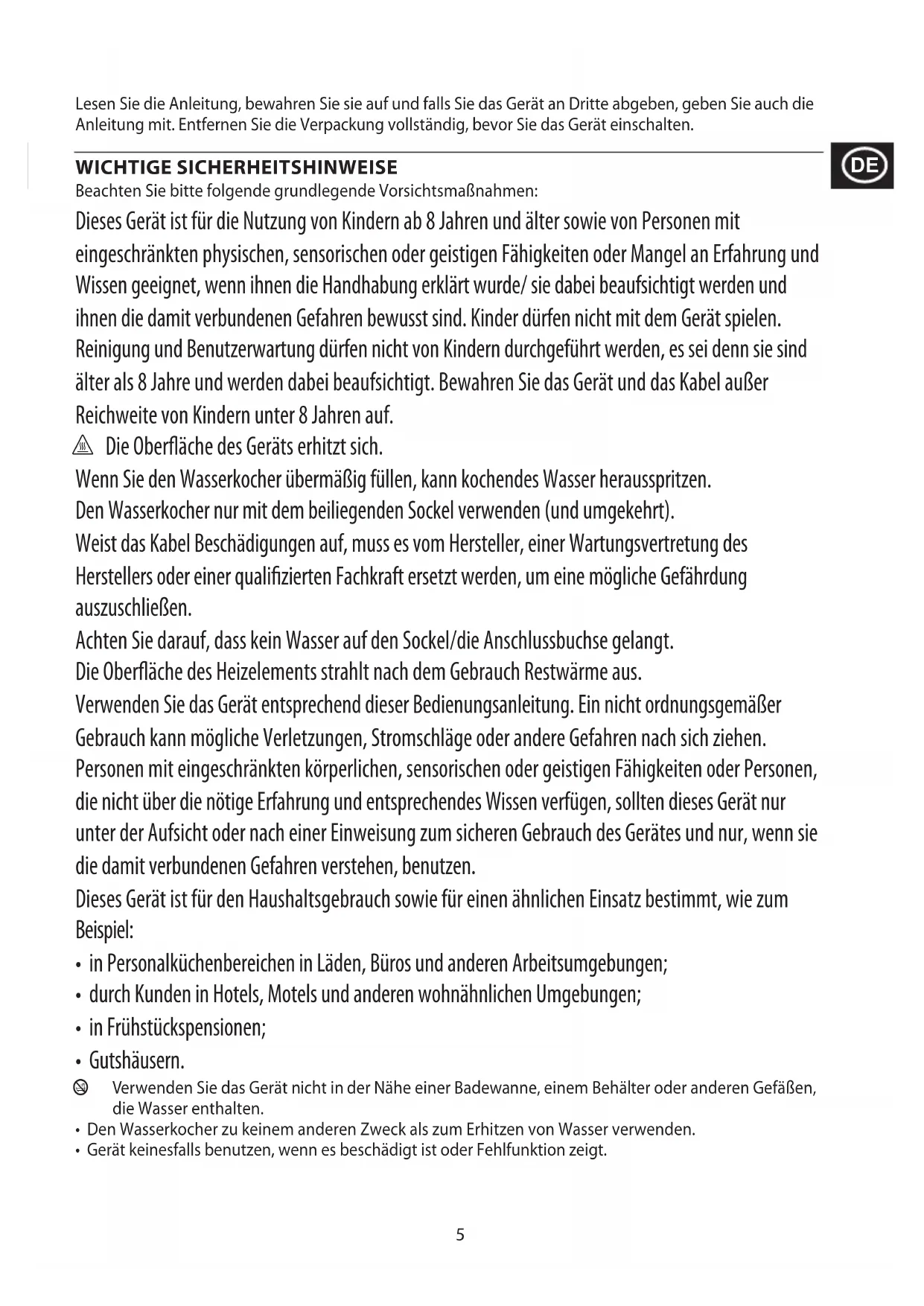 - Den Wasserkocher zu keinem anderen Zweck als zum Erhitzen von Wasser verwenden.