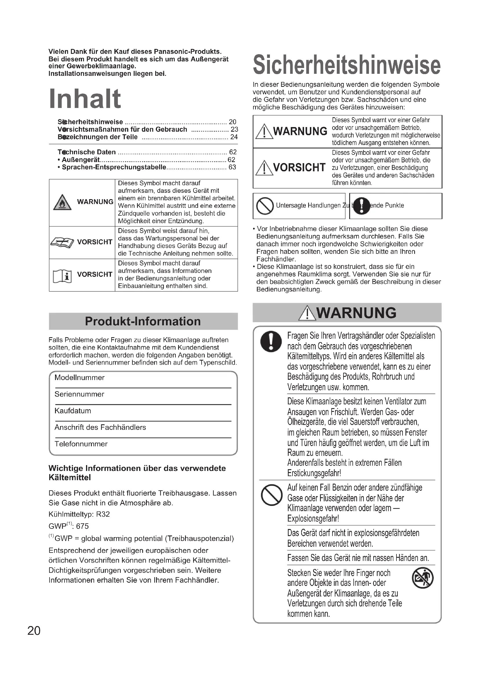 - Sprachen-Entsprechungstabelle................................ 63 Inhalt Sicherheitshinweise Produkt-Information Falls Probleme oder Fragen zu dieser Klimaanlage auftreten sollten, die eine Kontaktaufnahme mit dem Kundendienst erforderlich machen, werden die folgenden Angaben benötigt. Modell- und Seriennummer benden sich auf dem Typenschild.Modellnummer Seriennummer KaufdatumAnschrift des FachhändlersTelefonnummer Fragen Sie Ihren Vertragshändler oder Spezialisten nach dem Gebrauch des vorgeschriebenen Kältemitteltyps. Wird ein anderes Kältemittel als das vorgeschriebene verwendet, kann es zu einer Beschädigung des Produkts, Rohrbruch und Verletzungen usw. kommen. Diese Klimaanlage besitzt keinen Ventilator zum Ansaugen von Frischluft. Werden Gas- oder Ölheizgeräte, die viel Sauerstoff verbrauchen, im gleichen Raum betrieben, so müssen Fenster und Türen häug geöffnet werden, um die Luft im Raum zu erneuern. Anderenfalls besteht in extremen Fällen Erstickungsgefahr! Auf keinen Fall Benzin oder andere zündfähige Gase oder Flüssigkeiten in der Nähe der Klimaanlage verwenden oder lagern — Explosionsgefahr! Das Gerät darf nicht in explosionsgefährdeten Bereichen verwendet werden. Fassen Sie das Gerät nie mit nassen Händen an. Stecken Sie weder Ihre Finger noch andere Objekte in das Innen- oder Außengerät der Klimaanlage, da es zu Verletzungen durch sich drehende Teile kommen kann. In dieser Bedienungsanleitung werden die folgenden Symbole verwendet, um Benutzer und Kundendienstpersonal auf die Gefahr von Verletzungen bzw. Sachschäden und eine mögliche Beschädigung des Gerätes hinzuweisen: WARNUNG Dieses Symbol warnt vor einer Gefahr oder vor unsachgemäßem Betrieb, wodurch Verletzungen mit möglicherweise tödlichem Ausgang entstehen können. VORSICHT Dieses Symbol warnt vor einer Gefahr oder vor unsachgemäßem Betrieb, die zu Verletzungen, einer Beschädigung des Gerätes und anderen Sachschäden führen könnten.Untersagte Handlungen Zu beachtende Punkte• Vor Inbetriebnahme dieser Klimaanlage sollten Sie diese Bedienungsanleitung aufmerksam durchlesen. Falls Sie danach immer noch irgendwelche Schwierigkeiten oder Fragen haben sollten, wenden Sie sich bitte an Ihren Fachhändler.• Diese Klimaanlage ist so konstruiert, dass sie für ein angenehmes Raumklima sorgt. Verwenden Sie sie nur für den beabsichtigten Zweck gemäß der Beschreibung in dieser Bedienungsanleitung. WARNUNG Vielen Dank für den Kauf dieses Panasonic-Produkts.Bei diesem Produkt handelt es sich um das Außengerät einer Gewerbeklimaanlage.Installationsanweisungen liegen bei.WARNUNGDieses Symbol macht darauf aufmerksam, dass dieses Gerät mit einem ein brennbaren Kühlmittel arbeitet. Wenn Kühlmittel austritt und eine externe Zündquelle vorhanden ist, besteht die Möglichkeit einer Entzündung.VORSICHTDieses Symbol weist darauf hin, dass das Wartungspersonal bei der Handhabung dieses Geräts Bezug auf die Technische Anleitung nehmen sollte.VORSICHTDieses Symbol macht darauf aufmerksam, dass Informationen in der Bedienungsanleitung oder Einbauanleitung enthalten sind.Wichtige Informationen über das verwendete KältemittelDieses Produkt enthält uorierte Treibhausgase. Lassen Sie Gase nicht in die Atmosphäre ab.Kühlmitteltyp: R32 GWP (1) : 675 (1) GWP = global warming potential (Treibhauspotenzial)Entsprechend der jeweiligen europäischen oder örtlichen Vorschriften können regelmäßige Kältemittel-Dichtigkeitsprüfungen vorgeschrieben sein. Weitere Informationen erhalten Sie von Ihrem Fachhändler. OI_00_302355_all.indb 20 2018/9/20 10:01:3121 DEUTSCH WARNUNG Wenn das Kühlmittel mit einer Flamme in Berührung kommt, wird ein toxisches Gas erzeugt. Schalten Sie die Klimaanlage vor der Reinigung oder Wartung zur Sicherheit aus, und trennen Sie das Gerät von der Spannungsquelle. In Notfällen ziehen Sie den Stecker aus der Netzsteckdose, schalten Sie den Trennschalter aus, oder schalten Sie das entsprechende Trennorgan ab, um das Innengerät von der Netzspannung zu trennen. In Übereinstimmung mit den gültigen nationalen und örtlichen Vorschriften entsorgen. Dieses Produkt darf unter keinen Umständen abgeändert oder zerlegt werden. Ein Abändern oder Zerlegen der Einheit kann einen Brand, einen Stromschlag oder eine Verletzung verursachen. Das Innere von Innen- und Außengeräten darf nicht von Benutzern gereinigt werden. Beauftragen Sie einen autorisierten Händler oder Servicetechniker mit der Reinigung. Sollte eine Betriebsstörung dieses Geräts auftreten, versuchen Sie nicht, diese eigenhändig zu beseitigen. Beauftragen Sie den Vertrieb oder Fachhändler mit Instandsetzungsarbeiten und der Entsorgung. Verwenden Sie keine veränderten Kabel, keine Mehrfachstecker, Verlängerungskabel oder Kabel ohne Spezikation, um ein Überhitzen und einen Brand zu vermeiden. Für den Anschluss jedes Geräts muss eine separate Steckdose vorhanden sein; innerhalb des ausschließlich für das Gerät verwendeten Stromversorgungskabels muss ein Trennschalter, ein Fehlerstromschutzschalter oder eine Fehlerstrom-Schutzeinrichtung zum Schutz gegen Überstrom vorhanden sein. Jedes Gerät muss zur Stromversorgung an einen eigenen Netzanschluss angeschlossen werden. Außerdem muss ein Trennschalter mit Trennabstand an allen Kontakten nach den vor Ort geltenden Verdrahtungsvorschriften in die Festverdrahtung eingebaut werden. Zum Schutz vor Gefahren durch Mängel in der Isolierung muss das Gerät geerdet werden. Das Gerät ist in einem Raum ohne andauernd arbeitende Zündquellen (z. B. offene Flammen, in Betrieb bendliches Gasgerät oder in Betrieb bendliche Elektroheizung) zu lagern. Kühlmittel können geruchlos sein. Ein nicht belüfteter Bereich, an dem das mit brennbaren Kühlmitteln arbeitende Gerät installiert wird, ist so auszuführen, dass in dem Fall, dass Kühlmittel austritt, dieses nicht stockt und dadurch eine Brand- oder Explosionsgefahr hervorruft. Das Gerät ist in einem gut belüft