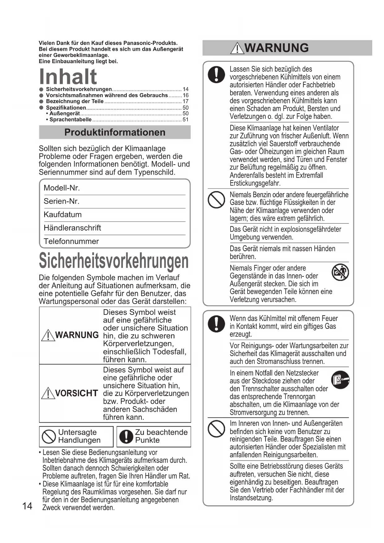 - Sprachentabelle ........................................................... 51 Inhalt Sicherheitsvorkehrungen Produktinformationen Sollten sich bezüglich der Klimaanlage Probleme oder Fragen ergeben, werden die folgenden Informationen benötigt. Modell- und Seriennummer sind auf dem Typenschild. Modell-Nr. Serien-Nr. Kaufdatum Händleranschrift Telefonnummer Lassen Sie sich bezüglich des vorgeschriebenen Kühlmittels von einem autorisierten Händler oder Fachbetrieb beraten. Verwendung eines anderen als des vorgeschriebenen Kühlmittels kann einen Schaden am Produkt, Bersten und Verletzungen o. dgl. zur Folge haben. Diese Klimaanlage hat keinen Ventilator zur Zuführung von frischer Außenluft. Wenn zusätzlich viel Sauerstoff verbrauchende Gas- oder Ölheizungen im gleichen Raum verwendet werden, sind Türen und Fenster zur Belüftung regelmäßig zu öffnen. Anderenfalls besteht im Extremfall Erstickungsgefahr. Niemals Benzin oder andere feuergefährliche Gase bzw. üchtige Flüssigkeiten in der Nähe der Klimaanlage verwenden oder lagern; dies wäre extrem gefährlich. Das Gerät nicht in explosionsgefährdeter Umgebung verwenden. Das Gerät niemals mit nassen Händen berühren. Niemals Finger oder andere Gegenstände in das Innen- oder Außengerät stecken. Die sich im Gerät bewegenden Teile können eine Verletzung verursachen. Wenn das Kühlmittel mit offenem Feuer in Kontakt kommt, wird ein giftiges Gas erzeugt. Vor Reinigungs- oder Wartungsarbeiten zur Sicherheit das Klimagerät ausschalten und auch den Stromanschluss trennen. In einem Notfall den Netzstecker aus der Steckdose ziehen oder den Trennschalter ausschalten oder das entsprechende Trennorgan abschalten, um die Klimaanlage von der Stromversorgung zu trennen. Im Inneren von Innen- und Außengeräten benden sich keine vom Benutzer zu reinigenden Teile. Beauftragen Sie einen autorisierten Händler oder Spezialisten mit anfallenden Reinigungsarbeiten. Sollte eine Betriebsstörung dieses Geräts auftreten, versuchen Sie nicht, diese eigenhändig zu beseitigen. Beauftragen Sie den Vertrieb oder Fachhändler mit der Instandsetzung. Die folgenden Symbole machen im Verlauf der Anleitung auf Situationen aufmerksam, die eine potentielle Gefahr für den Benutzer, das Wartungspersonal oder das Gerät darstellen: WARNUNG Dieses Symbol weist auf eine gefährliche oder unsichere Situation hin, die zu schweren Körperverletzungen, einschließlich Todesfall, führen kann. VORSI CHT Dieses Symbol weist auf eine gefährliche oder unsichere Situation hin, die zu Körperverletzungen bzw. Produkt- oder anderen Sachschäden führen kann. Untersagte Handlungen Zu beachtende Punkte Vielen Dank für den Kauf dieses Panasonic-Produkts.Bei diesem Produkt handelt es sich um das Außengerät einer Gewerbeklimaanlage.Eine Einbauanleitung liegt bei.