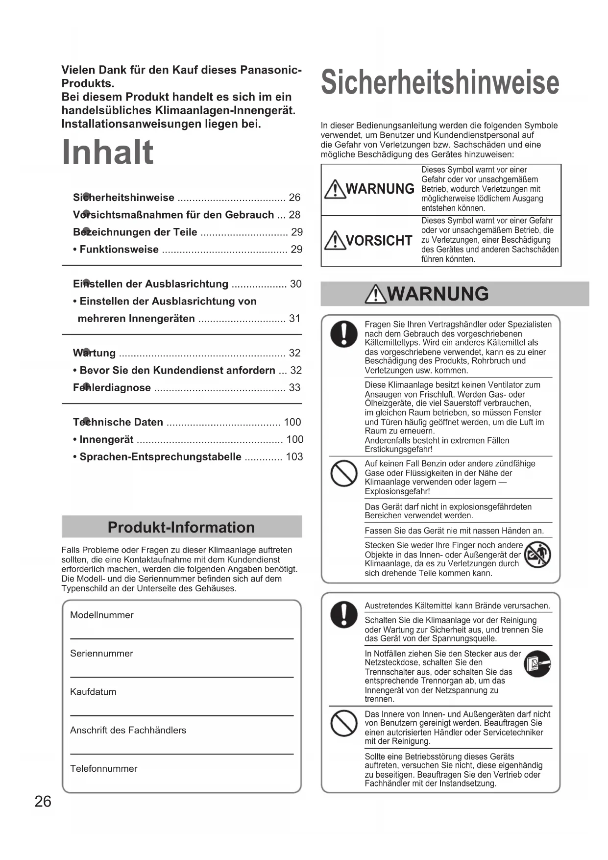 - El objetivo de esta medida es suavizar el funcionamiento. Compruebe antes de realizar consultas o solicitar tareas de servicio. OI_F569617_EU_L.indb 25 2013-12-17 17:58:0926 zSicherheitshinweise ..................................... 26 zVorsichtsmaßnahmen für den Gebrauch ... 28 zBezeichnungen der Teile .............................. 29•Funktionsweise ........................................... 29 zEinstellen der Ausblasrichtung ................... 30•Einstellen der Ausblasrichtung von mehreren Innengeräten .............................. 31 zWartung ......................................................... 32•Bevor Sie den Kundendienst anfordern ... 32 zFehlerdiagnose ............................................. 33 zTechnische Daten ....................................... 100•Innengerät .................................................. 100•Sprachen-Entsprechungstabelle ............. 103 Inhalt Sicherheitshinweise Produkt-Information Falls Probleme oder Fragen zu dieser Klimaanlage auftreten sollten, die eine Kontaktaufnahme mit dem Kundendienst erforderlich machen, werden die folgenden Angaben benötigt. Die Modell- und die Seriennummer benden sich auf dem Typenschild an der Unterseite des Gehäuses.Modellnummer Seriennummer KaufdatumAnschrift des FachhändlersTelefonnummerFragen Sie Ihren Vertragshändler oder Spezialisten nach dem Gebrauch des vorgeschriebenen Kältemitteltyps. Wird ein anderes Kältemittel als das vorgeschriebene verwendet, kann es zu einer Beschädigung des Produkts, Rohrbruch und Verletzungen usw. kommen.Diese Klimaanlage besitzt keinen Ventilator zum Ansaugen von Frischluft. Werden Gas- oder Ölheizgeräte, die viel Sauerstoff verbrauchen, im gleichen Raum betrieben, so müssen Fenster und Türen häug geöffnet werden, um die Luft im Raum zu erneuern. Anderenfalls besteht in extremen Fällen Erstickungsgefahr!Auf keinen Fall Benzin oder andere zündfähige Gase oder Flüssigkeiten in der Nähe der Klimaanlage verwenden oder lagern — Explosionsgefahr!Das Gerät darf nicht in explosionsgefährdeten Bereichen verwendet werden.Fassen Sie das Gerät nie mit nassen Händen an.Stecken Sie weder Ihre Finger noch andere Objekte in das Innen- oder Außengerät der Klimaanlage, da es zu Verletzungen durch sich drehende Teile kommen kann.Austretendes Kältemittel kann Brände verursachen.Schalten Sie die Klimaanlage vor der Reinigung oder Wartung zur Sicherheit aus, und trennen Sie das Gerät von der Spannungsquelle.In Notfällen ziehen Sie den Stecker aus der Netzsteckdose, schalten Sie den Trennschalter aus, oder schalten Sie das entsprechende Trennorgan ab, um das Innengerät von der Netzspannung zu trennen.Das Innere von Innen- und Außengeräten darf nicht von Benutzern gereinigt werden. Beauftragen Sie einen autorisierten Händler oder Servicetechniker mit der Reinigung.Sollte eine Betriebsstörung dieses Geräts auftreten, versuchen Sie nicht, diese eigenhändig zu beseitigen. Beauftragen Sie den Vertrieb oder Fachhändler mit der Instandsetzung.In dieser Bedienungsanleitung werden die folgenden Symbole verwendet, um Benutzer und Kundendienstpersonal auf die Gefahr von Verletzungen bzw. Sachschäden und eine mögliche Beschädigung des Gerätes hinzuweisen: WARNUNG Dieses Symbol warnt vor einer Gefahr oder vor unsachgemäßem Betrieb, wodurch Verletzungen mit möglicherweise tödlichem Ausgang entstehen können. VORSICHT Dieses Symbol warnt vor einer Gefahr oder vor unsachgemäßem Betrieb, die zu Verletzungen, einer Beschädigung des Gerätes und anderen Sachschäden führen könnten. WARNUNG Vielen Dank für den Kauf dieses Panasonic- Produkts. Bei diesem Produkt handelt es sich im ein handelsübliches Klimaanlagen-Innengerät. Installationsanweisungen liegen bei. OI_F569617_EU_L.indb 26 2013-12-17 17:58:1027 DEUTSCH Das Gerät kann sowohl von Experten und geschulten Anwendern, in Geschäften, in der Leichtindustrie und Landwirtschaft, als auch von Endverbrauchern eingesetzt werden. Dieses Gerät eignet sich für Kinder ab 8 Jahre sowie Personen mit eingeschränkten körperlichen, sensorischen bzw. geistigen Fähigkeiten oder ohne ausreichende Erfahrungen, sofern sie beim Gebrauch beaufsichtigt werden oder Anweisungen für den sicheren Betrieb des Geräts erhalten haben und sich der mit dem Gebrauch in Zusammenhang stehenden Risiken bewusst sind. Feuermelder und Luftauslass müssen mindestens 1,5 m vom Gerät entfernt sein. Achten Sie stets darauf, den Raum nicht zu stark zu kühlen oder zu heizen, wenn Kleinkinder oder Kranke anwesend sind. Schalten Sie die Klimaanlage nicht mit Hilfe des Netztrennschalters ein und aus. Verwenden Sie dazu grundsätzlich die Betriebstaste (ON/OFF). Stecken Sie keine Gegenstände in den Luftauslass des Außengeräts. Dies ist gefährlich, weil der Ventilator mit hoher Drehzahl rotiert. Berühren Sie nicht den Lufteinlass oder die scharfen Aluminium-Kühlrippen am Außengerät. Es besteht Verletzungsgefahr. Setzen oder stellen Sie sich nicht auf das Gerät. Es besteht Sturzgefahr. Kleben Sie keine Objekte auf das VENTILATORGEHÄUSE. Es besteht die Gefahr von Verletzungen und Geräteschäden. Für den Anschluss jedes Geräts muss eine Steckdose vorhanden sein; innerhalb des ausschließlich für das Gerät verwendeten Stromversorgungskreises muss ein Unterbrecher, ein Schutzschalter und ein Lecktrennschalter für Überstrom vorhanden sein. Jedes Gerät muss zur Stromversorgung an einen eigenen Netzanschluss angeschlossen werden. Außerdem muss ein Trennschalter mit Trennabstand an allen Kontakten nach den vor Ort geltenden Verdrahtungsvorschriften in die Festverdrahtung eingebaut werden. Zum Schutz vor Gefahren durch Mängel in der Isolierung muss das Gerät geerdet werden. Verwenden Sie keine veränderten Kabel, keine Mehrfachstecker, Verlängerungskabel oder Kabel ohne Spezikation, um ein Überhitzen und einen Brand zu vermeiden. Im Fall einer Funktionsstörung oder einer Fehlfunktion ist das Produkt auszuschalten u