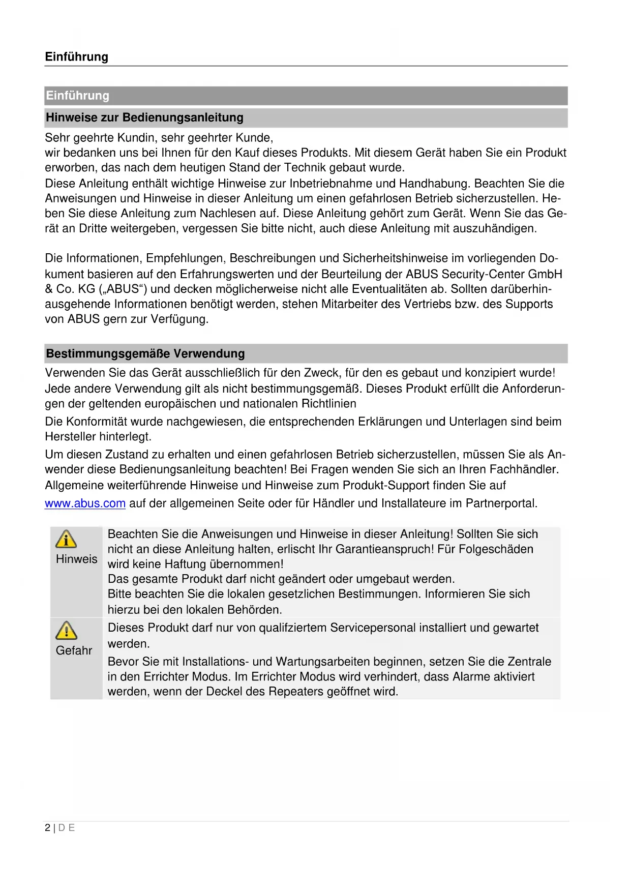 Die Informationen, Empfehlungen, Beschreibungen und Sicherheitshinweise im vorliegenden Dokument basieren auf den Erfahrungswerten und der Beurteilung der ABUS Security-Center GmbH & Co. KG ("ABUS") unddecken möglicherweise nicht alle Eventualitäten ab. Sollten darüberhin-ausgehende Informationenbenötigt werden, stehen Mitarbeiter des Vertriebs bzw. des Supports von ABUS gern zur Verfügung.
