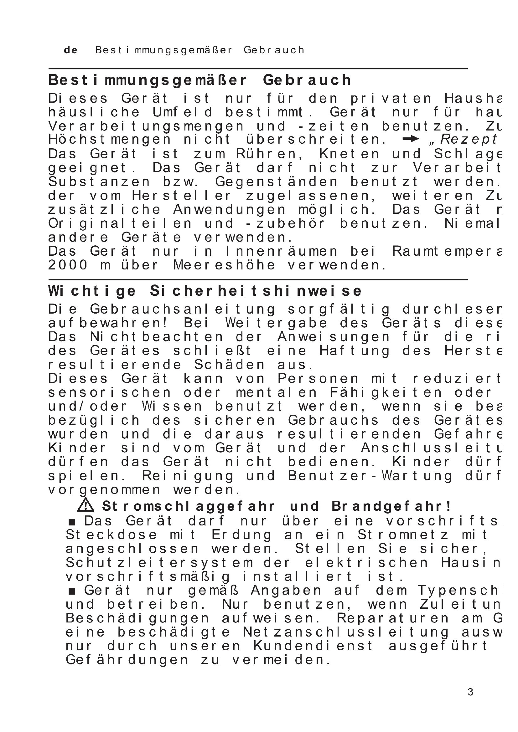 asser ■ Alle Zutaten ca. 3 bis 5 Minuten auf Stufe 3 zu einem Teig verarbeiten. Höchstmenge: 1,5 x Grundrezept Brotteig Grundrezept – 1000 g Mehl – 3 Päckchen Trockenhefe – 2 TL Salz – 660 ml warmes Wasser ■ Alle Zutaten ca. ½ Minute auf Stufe 1, dann ca. 4-5 Minuten auf Stufe 3 mit dem Knethaken verarbeiten. Höchstmenge: 1,5 x Grundrezept Feineinstellung der Werkzeuge W Verletzungsgefahr! Vor der Feineinstellung den Netzstecker ausstecken. Achtung! Die Feineinstellung der Werkzeuge nur in kleinen Schritten vornehmen. Der Schwenkarm muss vollständig abgesenkt werden können und die Werkzeuge dürfen dabei nicht am Boden und am Rand der Schüssel klemmen. Der optimale Abstand der Werkzeuge zur Schüssel beträgt 3 mm. X Bildfolge O ■ Mit eingesetztem Profi Schlagbesen die aktuelle Einstellung überprüfen. ■ Entriegelungstaste drücken und Schwenkarm bis zum Anschlag anheben. ■ Werkzeug mit einer Hand festhalten. Kontermutter mit einem Gabelschlüssel (10 mm) im Uhrzeigersinn lösen.18 de Sicherheitssysteme ■ Abstand zur Schüssel durch Drehen des Werkzeugs einstellen (1 ganze Umdrehung entspricht 1 mm Höhen- verstellung). Gegen den Uhrzeigersinn drehen: Abstand zur Schüssel wird geringer. Im Uhrzeigersinn drehen: Abstand zur Schüssel wird größer. ■ Entriegelungstaste drücken und Schwenkarm bis zum Einrasten nach unten drücken. ■ Abstand des Werkzeugs überprüfen. Der optimale Abstand der Werkzeuge zur Schüssel beträgt 3 mm. Gegebenenfalls den Abstand anpassen. ■ Ist der Abstand optimal eingestellt, Entriegelungstaste drücken und Schwenkarm zurückkippen. ■ Werkzeug mit einer Hand festhalten. Kontermutter mit einem Gabelschlüssel (10 mm) gegen den Uhrzeigersinn festdrehen. Sicherheitssysteme Einschaltsicherung Das Gerät lässt sich nur einschalten, wenn die Schüssel eingesetzt und bis zum Einrasten gedreht wurde oder wenn ein Zubehör mit Winkelgetriebe am Haupt antrieb befestigt wurde und wenn der Schwenkarm in der unteren Position eingerastet ist. Wiedereinschaltsicherung Das Gerät bleibt bei Stromunterbrechung eingeschaltet, aber der Motor läuft danach nicht wieder an. Zum Wiedereinschalten Drehschalter zuerst auf y stellen, dann erneut einschalten. Überlastsicherung Die Überlastsicherung schaltet den Motor während der Benutzung selbständig ab. Eine mögliche Ursache kann die Verarbeitung zu großer Mengen sein. Schwenkarmsicherung Der Schwenkarm lässt sich nicht entriegeln und bewegen, wenn auf dem hinteren Antrieb ein Zubehör angebracht ist. Entsorgung