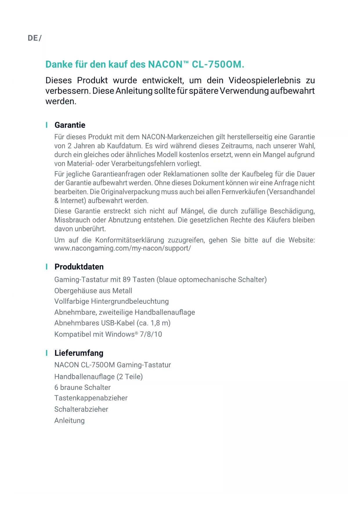 7/8/10 sont des marques déposées par Microsoft Corporation.DE / Danke für den kauf des NACON™ CL-750OM. Dieses Produkt wurde entwickelt, um dein Videospielerlebnis zu verbessern. Diese Anleitung sollte für spätere Verwendung aufbewahrt werden. I Garantie Für dieses Produkt mit dem NACON-Markenzeichen gilt herstellerseitig eine Garantie von 2 Jahren ab Kaufdatum. Es wird während dieses Zeitraums, nach unserer Wahl, durch ein gleiches oder ähnliches Modell kostenlos ersetzt, wenn ein Mangel aufgrund von Material- oder Verarbeitungsfehlern vorliegt. Für jegliche Garantieanfragen oder Reklamationen sollte der Kaufbeleg für die Dauer der Garantie aufbewahrt werden. Ohne dieses Dokument können wir eine Anfrage nicht bearbeiten. Die Originalverpackung muss auch bei allen Fernverkäufen (Versandhandel & Internet) aufbewahrt werden. Diese Garantie erstreckt sich nicht auf Mängel, die durch zufällige Beschädigung, Missbrauch oder Abnutzung entstehen. Die gesetzlichen Rechte des Käufers bleiben davon unberührt. Um auf die Konformitätserklärung zuzugreifen, gehen Sie bitte auf die Website: www.nacongaming.com/my-nacon/support/ I Produktdaten Gaming-Tastatur mit 89 Tasten (blaue optomechanische Schalter) Obergehäuse aus Metall Vollfarbige Hintergrundbeleuchtung Abnehmbare, zweiteilige Handballenauage Abnehmbares USB-Kabel (ca. 1,8 m) Kompatibel mit Windows