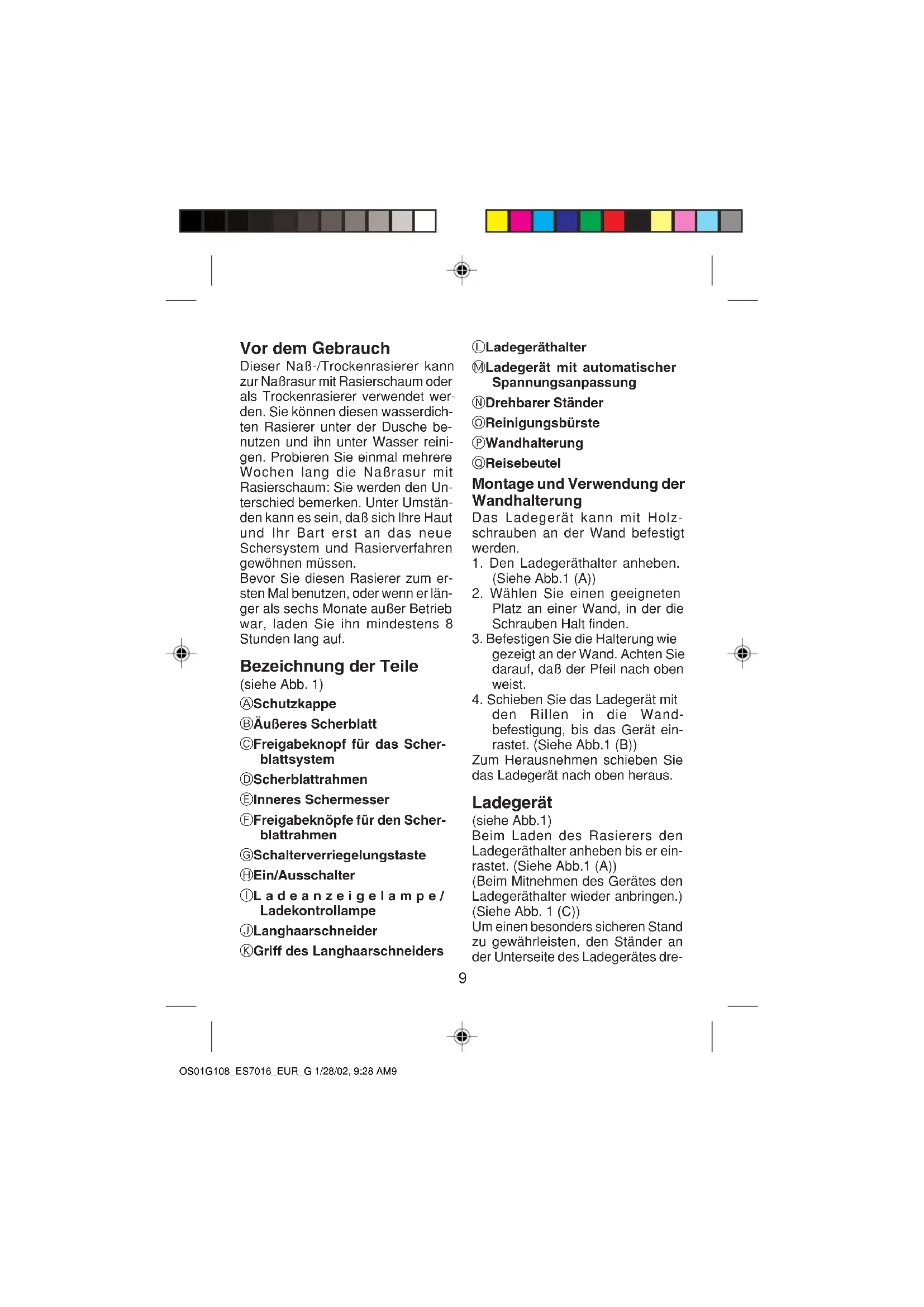 - Always use your shaver for its in- tended use, as described in this manual. This product is intended for house- hold use only. OS01G108_ES7016_EUR_en 1/28/02, 9:29 AM89 Vor dem Gebrauch Dieser Naß-/Trockenrasierer kann zur Naßrasur mit Rasierschaum oder als Trockenrasierer verwendet wer- den. Sie können diesen wasserdich- ten Rasierer unter der Dusche be- nutzen und ihn unter Wasser reini- gen. Probieren Sie einmal mehrere Wochen lang die Naßrasur mit Rasierschaum: Sie werden den Un- terschied bemerken. Unter Umstän- den kann es sein, daß sich Ihre Haut und Ihr Bart erst an das neue Schersystem und Rasierverfahren gewöhnen müssen. Bevor Sie diesen Rasierer zum er- sten Mal benutzen, oder wenn er län- ger als sechs Monate außer Betrieb war, laden Sie ihn mindestens 8 Stunden lang auf. Bezeichnung der Teile (siehe Abb. 1) A Schutzkappe B Äußeres Scherblatt C Freigabeknopf für das Scher- blattsystem D Scherblattrahmen E Inneres Schermesser F Freigabeknöpfe für den Scher- blattrahmen G Schalterverriegelungstaste H Ein/Ausschalter I Ladeanzeigelampe/ Ladekontrollampe J Langhaarschneider K Griff des Langhaarschneiders L Ladegeräthalter M Ladegerät mit automatischer Spannungsanpassung N Drehbarer Ständer O Reinigungsbürste P Wandhalterung Q Reisebeutel Montage und Verwendung der Wandhalterung Das Ladegerät kann mit Holz- schrauben an der Wand befestigt werden.