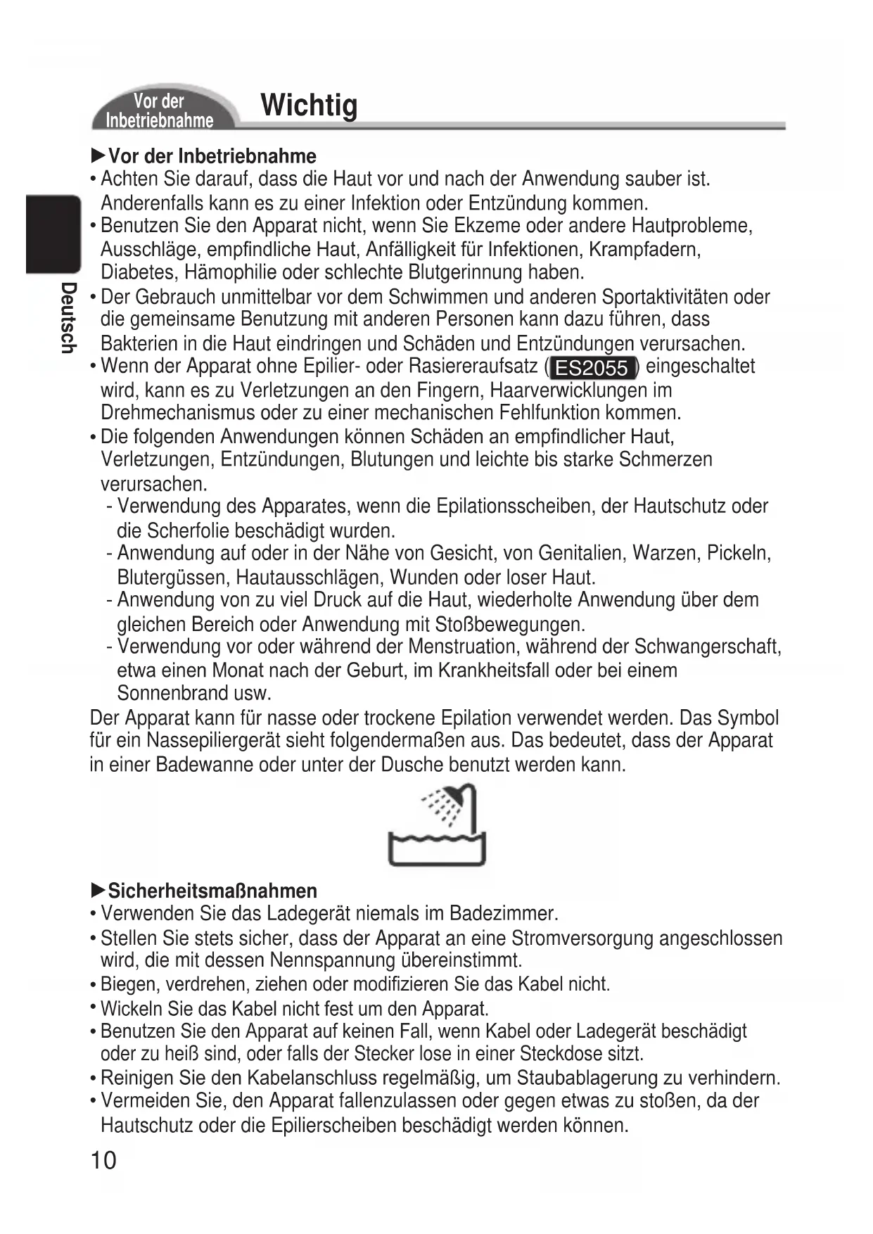 Trimmer Frame Pop-up trimmer switch Frame release button Accessories: Charger (RE7- 44), cleaning brush and pouch (Please do not use accessories any other than the accessories provided.)10 Deutsch Wichtig Vor der Inbetriebnahme 1Vor der Inbetriebnahme Achten Sie darauf, dass die Haut vor und nach der Anwendung sauber ist. Anderenfalls kann es zu einer Infektion oder Entzündung kommen. Benutzen Sie den Apparat nicht, wenn Sie Ekzeme oder andere Hautprobleme, Ausschläge, empndliche Haut, Anfälligkeit für Infektionen, Krampfadern, Diabetes, Hämophilie oder schlechte Blutgerinnung haben. Der Gebrauch unmittelbar vor dem Schwimmen und anderen Sportaktivitäten oder die gemeinsame Benutzung mit anderen Personen kann dazu führen, dass Bakterien in die Haut eindringen und Schäden und Entzündungen verursachen. Wenn der Apparat ohne Epilier- oder Rasiereraufsatz ( ES2055 ) eingeschaltet wird, kann es zu Verletzungen an den Fingern, Haarverwicklungen im Drehmechanismus oder zu einer mechanischen Fehlfunktion kommen. Die folgenden Anwendungen können Schäden an empndlicher Haut, Verletzungen, Entzündungen, Blutungen und leichte bis starke Schmerzen verursachen. Verwendung des Apparates, wenn die Epilationsscheiben, der Hautschutz oder die Scherfolie beschädigt wurden. Anwendung auf oder in der Nähe von Gesicht, von Genitalien, Warzen, Pickeln, Blutergüssen, Hautausschlägen, Wunden oder loser Haut. Anwendung von zu viel Druck auf die Haut, wiederholte Anwendung über dem gleichen Bereich oder Anwendung mit Stoßbewegungen. Verwendung vor oder während der Menstruation, während der Schwangerschaft, etwa einen Monat nach der Geburt, im Krankheitsfall oder bei einem Sonnenbrand usw. Der Apparat kann für nasse oder trockene Epilation verwendet werden. Das Symbol für ein Nassepiliergerät sieht folgendermaßen aus. Das bedeutet, dass der Apparat in einer Badewanne oder unter der Dusche benutzt werden kann. 1Sicherheitsmaßnahmen Verwenden Sie das Ladegerät niemals im Badezimmer. Stellen Sie stets sicher, dass der Apparat an eine Stromversorgung angeschlossen wird, die mit dessen Nennspannung übereinstimmt. Biegen, verdrehen, ziehen oder modizieren Sie das Kabel nicht. Wickeln Sie das Kabel nicht fest um den Apparat. Benutzen Sie den Apparat auf keinen Fall, wenn Kabel oder Ladegerät beschädigt oder zu heiß sind, oder falls der Stecker lose in einer Steckdose sitzt. Reinigen Sie den Kabelanschluss regelmäßig, um Staubablagerung zu verhindern. Vermeiden Sie, den Apparat fallenzulassen oder gegen etwas zu stoßen, da der Hautschutz oder die Epilierscheiben beschädigt werden können.