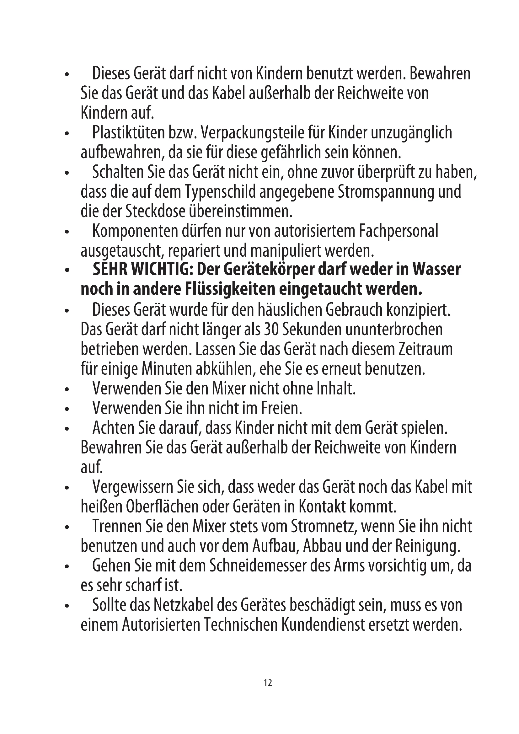 - SEHR WICHTIG: Der Gerätekörper darf weder in Wasser noch in andere Flüssigkeiten eingetaucht werden.