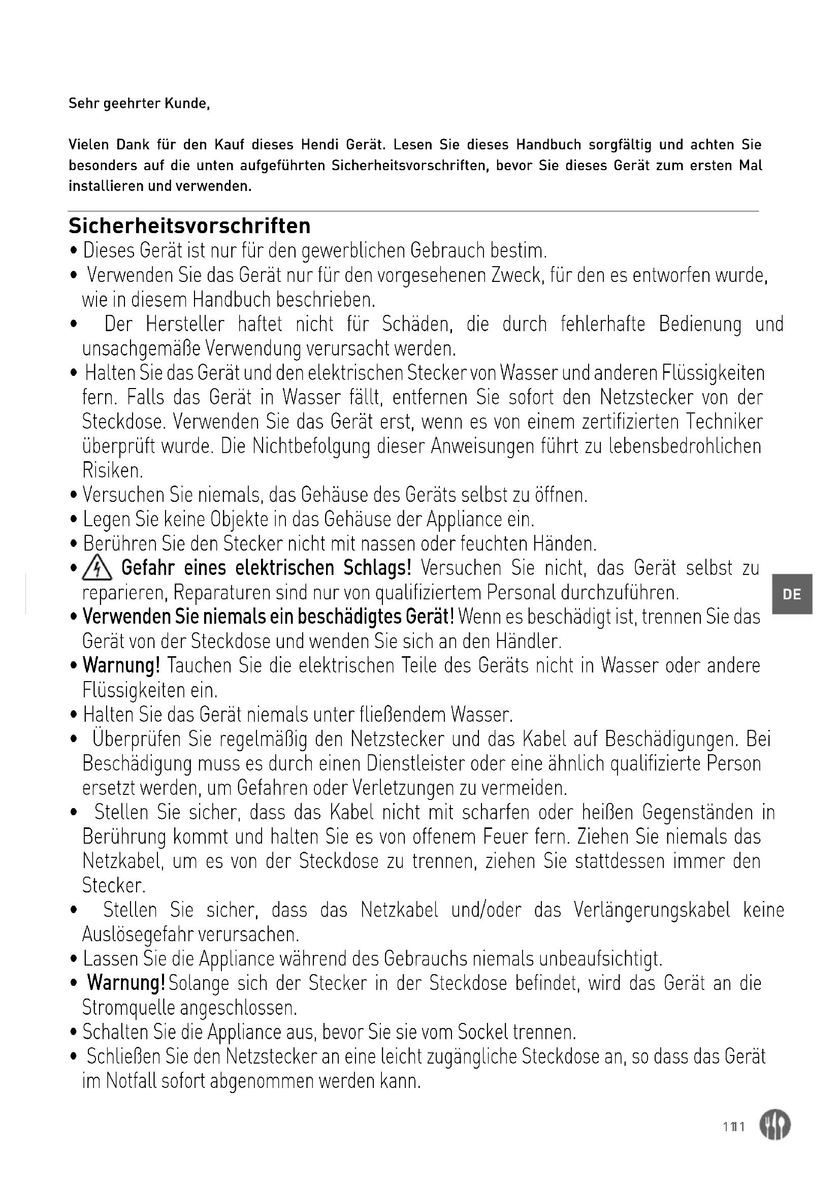 Sehr geehrter Kunde, Vielen Dank für den Kauf dieses Hendi Gerät. Lesen Sie dieses Handbuch sorgfältig und achten Sie besonders auf die unten aufgeführten Sicherheitsvorschriften, bevor Sie dieses Gerät zum ersten Mal installieren und verwenden. Sicherheitsvorschriften