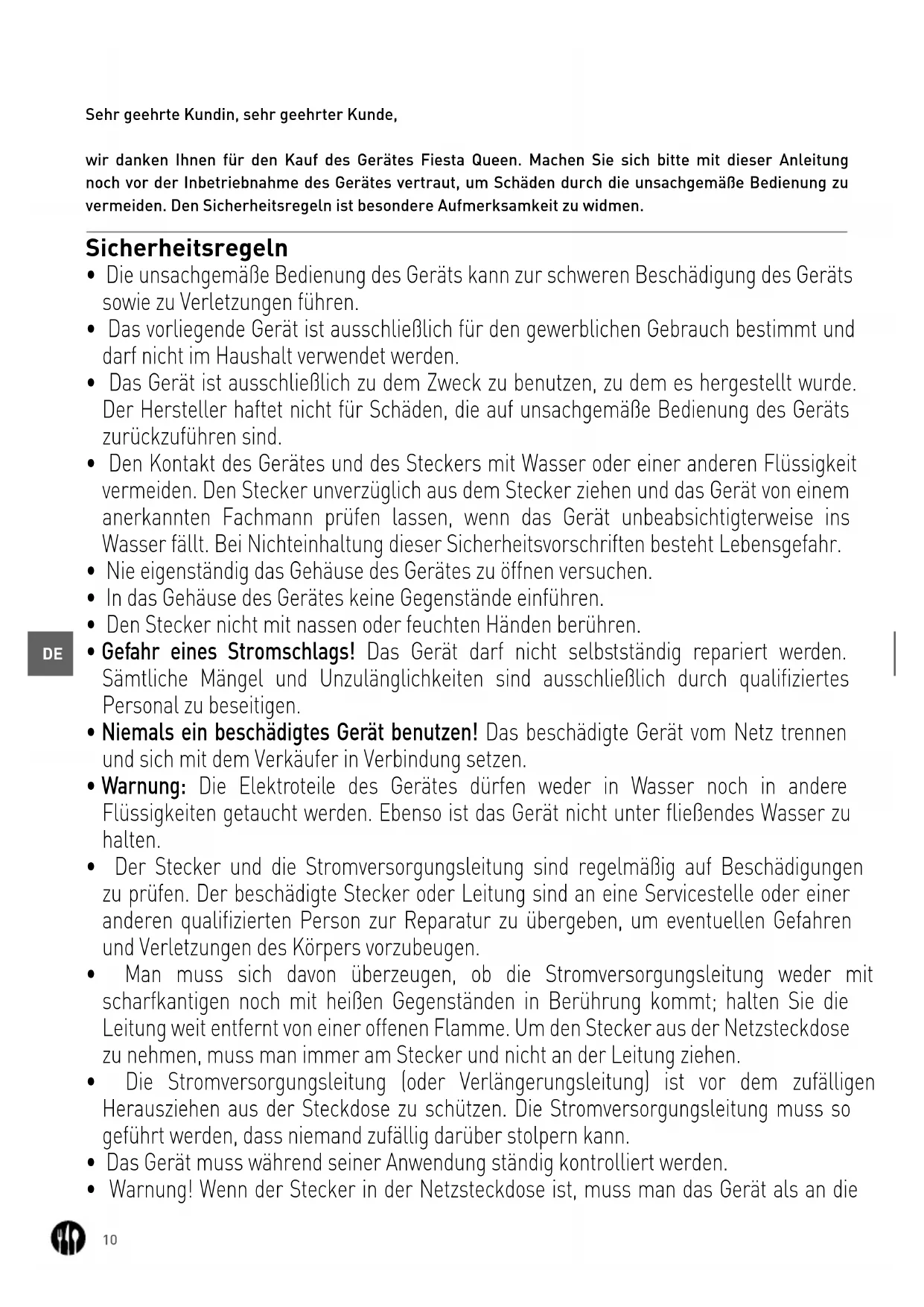 Sehr geehrte Kundin, sehr geehrter Kunde, wir danken Ihnen für den Kauf des Gerätes Fiesta Queen. Machen Sie sich bitte mit dieser Anleitung noch vor der Inbetriebnahme des Gerätes vertraut, um Schäden durch die unsachgemäße Bedienung zu vermeiden. Den Sicherheitsregeln ist besondere Aufmerksamkeit zu widmen. Sicherheitsregeln