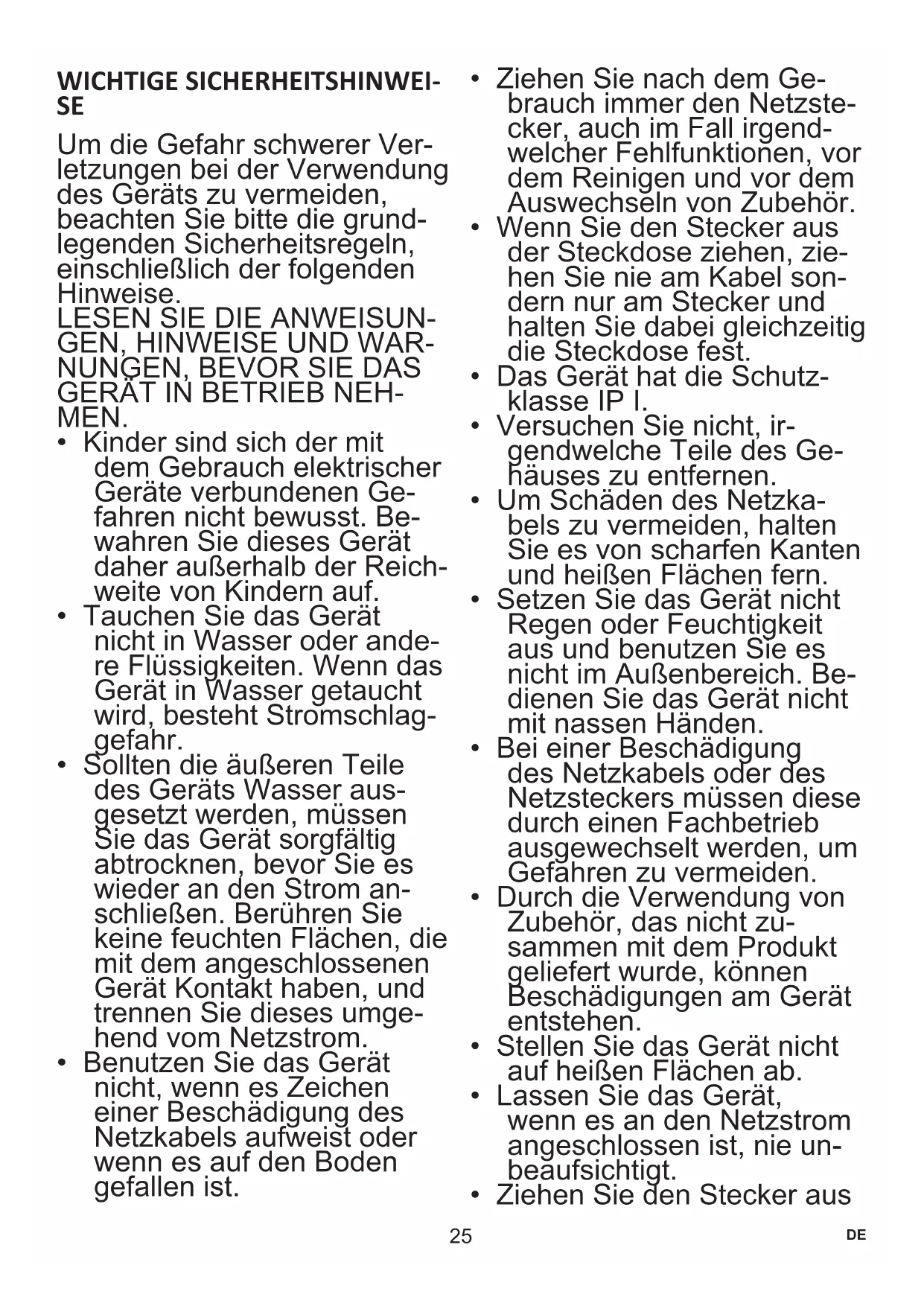 - Tauchen Sie das Gerät nicht in Wasser oder andere Flüssigkeiten. Dies kann eine Beschädigung des Motors und Stromschlaggefahr verursachen.