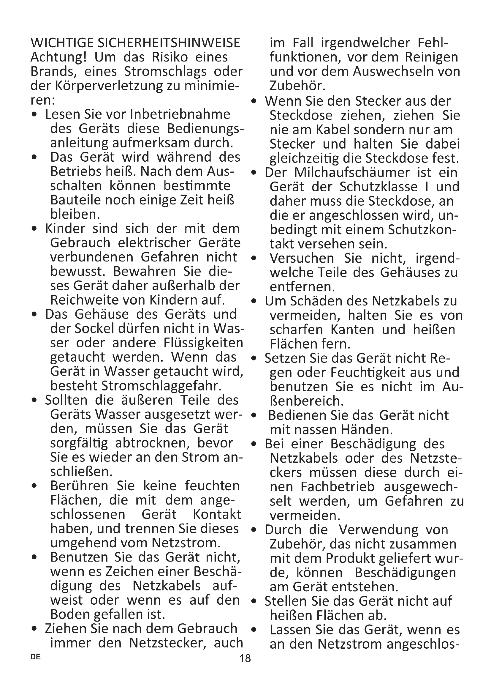 - Das Gerät ist zum Aufwärmen und/oder Aufschäumen von Milch besmmt, verwenden Sie das Gerät nicht für andere Zwecke.