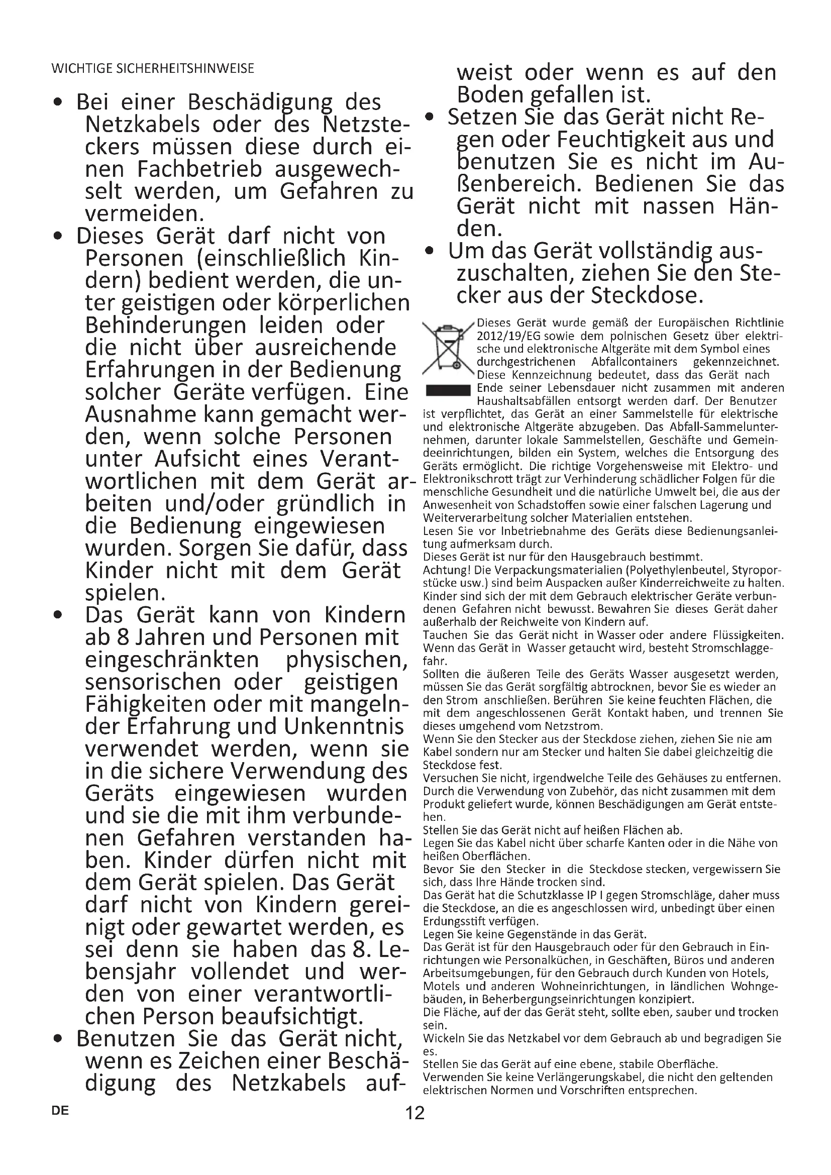 - Um das Gerät vollständig aus- zuschalten, ziehen Sie den Ste- cker aus der Steckdose. Dieses Gerät wurde gemäß der Europäischen Richtlinie 2012/19/EG sowie dem polnischen Gesetz über elektri- sche und elektronische Altgeräte mit dem Symbol eines durchgestrichenen Abfallcontainers gekennzeichnet. Diese Kennzeichnung bedeutet, dass das Gerät nach Ende seiner Lebensdauer nicht zusammen mit anderen Haushaltsabfällen entsorgt werden darf. Der Benutzer ist verpichtet, das Gerät an einer Sammelstelle für elektrische und elektronische Altgeräte abzugeben. Das AbfallSammelunter- nehmen, darunter lokale Sammelstellen, Geschäe und Gemein- deeinrichtungen, bilden ein System, welches die Entsorgung des Geräts ermöglicht. Die richge Vorgehensweise mit Elektro und Elektronikschro trägt zur Verhinderung schädlicher Folgen für die menschliche Gesundheit und die natürliche Umwelt bei, die aus der Anwesenheit von Schadstoen sowie einer falschen Lagerung und Weiterverarbeitung solcher Materialien entstehen. Lesen Sie vor Inbetriebnahme des Geräts diese Bedienungsanlei- tung aufmerksam durch. Dieses Gerät ist nur für den Hausgebrauch besmmt. Achtung! Die Verpackungsmaterialien (Polyethylenbeutel, Styropor- stücke usw.) sind beim Auspacken außer Kinderreichweite zu halten. Kinder sind sich der mit dem Gebrauch elektrischer Geräte verbun- denen Gefahren nicht bewusst. Bewahren Sie dieses Gerät daher außerhalb der Reichweite von Kindern auf. Tauchen Sie das Gerät nicht in Wasser oder andere Flüssigkeiten. Wenn das Gerät in Wasser getaucht wird, besteht Stromschlagge- fahr. Sollten die äußeren Teile des Geräts Wasser ausgesetzt werden, müssen Sie das Gerät sorgfälg abtrocknen, bevor Sie es wieder an den Strom anschließen. Berühren Sie keine feuchten Flächen, die mit dem angeschlossenen Gerät Kontakt haben, und trennen Sie dieses umgehend vom Netzstrom. Wenn Sie den Stecker aus der Steckdose ziehen, ziehen Sie nie am Kabel sondern nur am Stecker und halten Sie dabei gleichzeig die Steckdose fest. Versuchen Sie nicht, irgendwelche Teile des Gehäuses zu enernen. Durch die Verwendung von Zubehör, das nicht zusammen mit dem Produkt geliefert wurde, können Beschädigungen am Gerät entste- hen. Stellen Sie das Gerät nicht auf heißen Flächen ab. Legen Sie das Kabel nicht über scharfe Kanten oder in die Nähe von heißen Oberächen. Bevor Sie den Stecker in die Steckdose stecken, vergewissern Sie sich, dass Ihre Hände trocken sind. Das Gerät hat die Schutzklasse IP I gegen Stromschläge, daher muss die Steckdose, an die es angeschlossen wird, unbedingt über einen Erdungss verfügen. Legen Sie keine Gegenstände in das Gerät. Das Gerät ist für den Hausgebrauch oder für den Gebrauch in Ein- richtungen wie Personalküchen, in Geschäen, Büros und anderen Arbeitsumgebungen, für den Gebrauch durch Kunden von Hotels, Motels und anderen Wohneinrichtungen, in ländlichen Wohnge- bäuden, in Beherbergungseinrichtungen konzipiert. Die Fläche, auf der das Gerät steht, sollte eben, sauber und trocken sein. Wickeln Sie das Netzkabel vor dem Gebrauch ab und begradigen Sie es. Stellen Sie das Gerät auf eine ebene, stabile Oberäche. Verwenden Sie keine Verlängerungskabel, die nicht den geltenden elektrischen Normen und Vorschrien entsprechen. DE13
