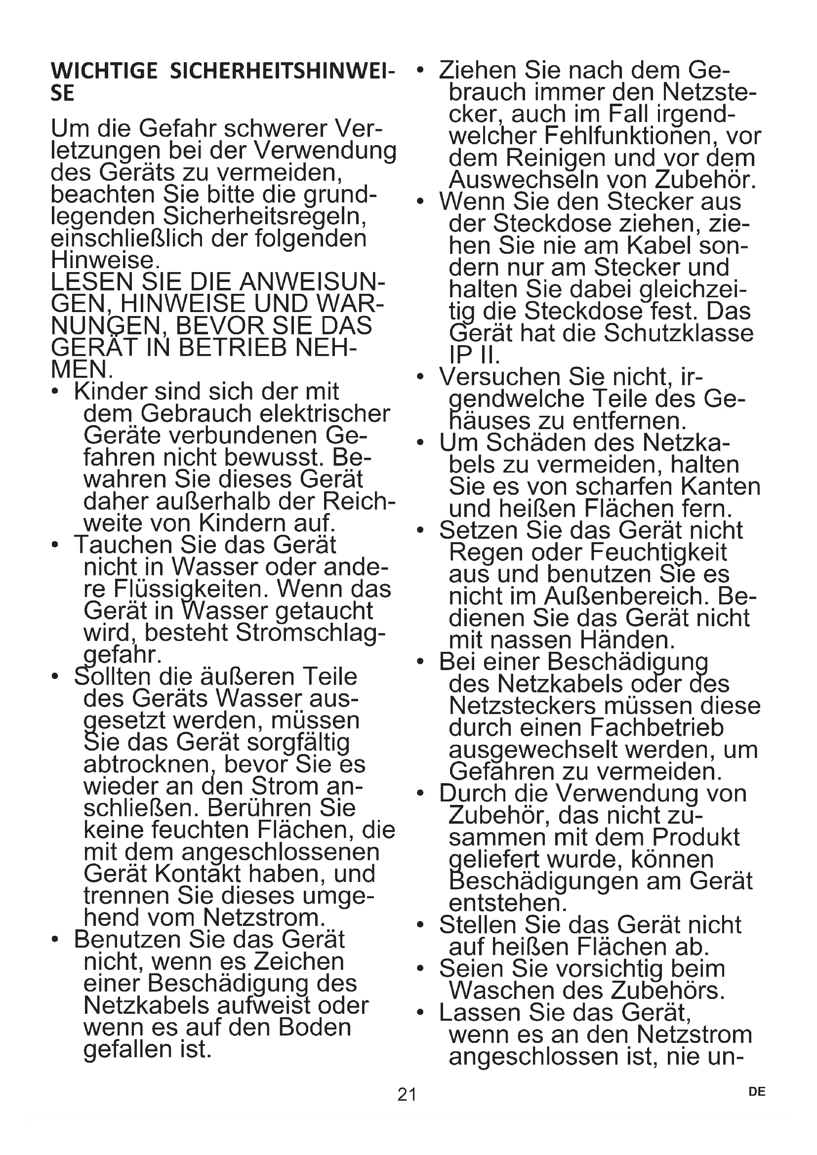- Wenn Sie den Stecker aus der Steckdose ziehen, zie- hen Sie nie am Kabel son- dern nur am Stecker und halten Sie dabei gleichzei- tig die Steckdose fest. Das Gerät hat die Schutzklasse IP II.