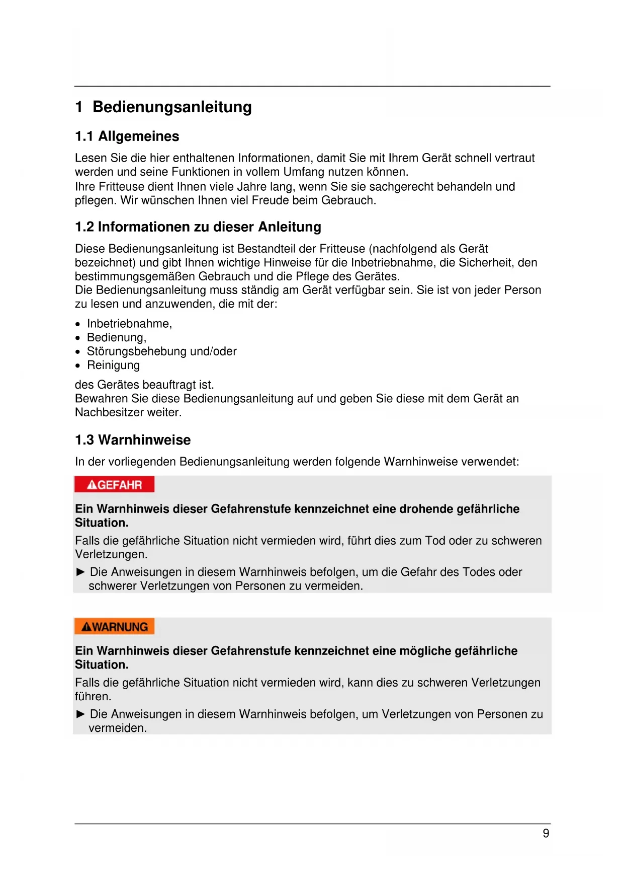 Diese Bedienungsanleitung ist Bestandteil der Fritteuse (nachfolgend als Gerät bezeichnet) und gibt Ihnen wichtige Hinweise für die Inbetriebnahme, die Sicherheit, den bestimmungsgemäßen Gebrauch und die Pflege des Gerätes. Die Bedienungsanleitung muss ständig am Gerät verfügbar sein. Sie ist von jeder Person zu lesen und anzuwenden, die mit der: