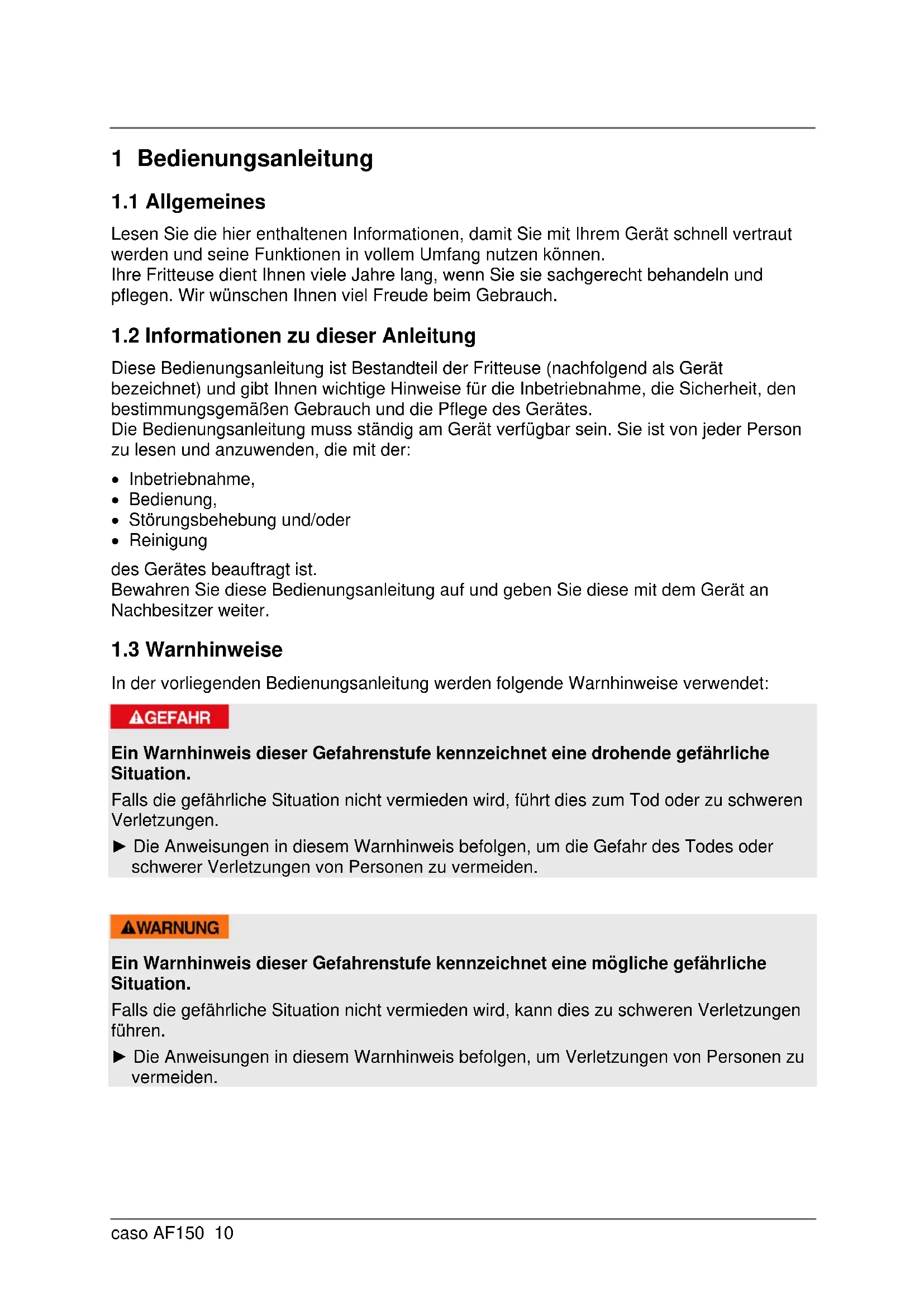 Ein Warnhinweis dieser Gefahrenstufe kennzeichnet eine mögliche gefährliche Situation. Falls die gefährliche Situation nicht vermieden wird, kann dies zu schweren Verletzungen führen. ► Die Anweisungen in diesem Warnhinweis befolgen, um Verletzungen von Personen zu vermeiden.caso AF150 11 Ein Warnhinweis dieser Gefahrenstufe kennzeichnet eine mögliche gefährliche Situation. Falls die gefährliche Situation nicht vermieden wird, kann dies zu leichten oder gemäßigten Verletzungen führen. ► Die Anweisungen in diesem Warnhinweis befolgen, um Verletzungen von Personen zu vermeiden.