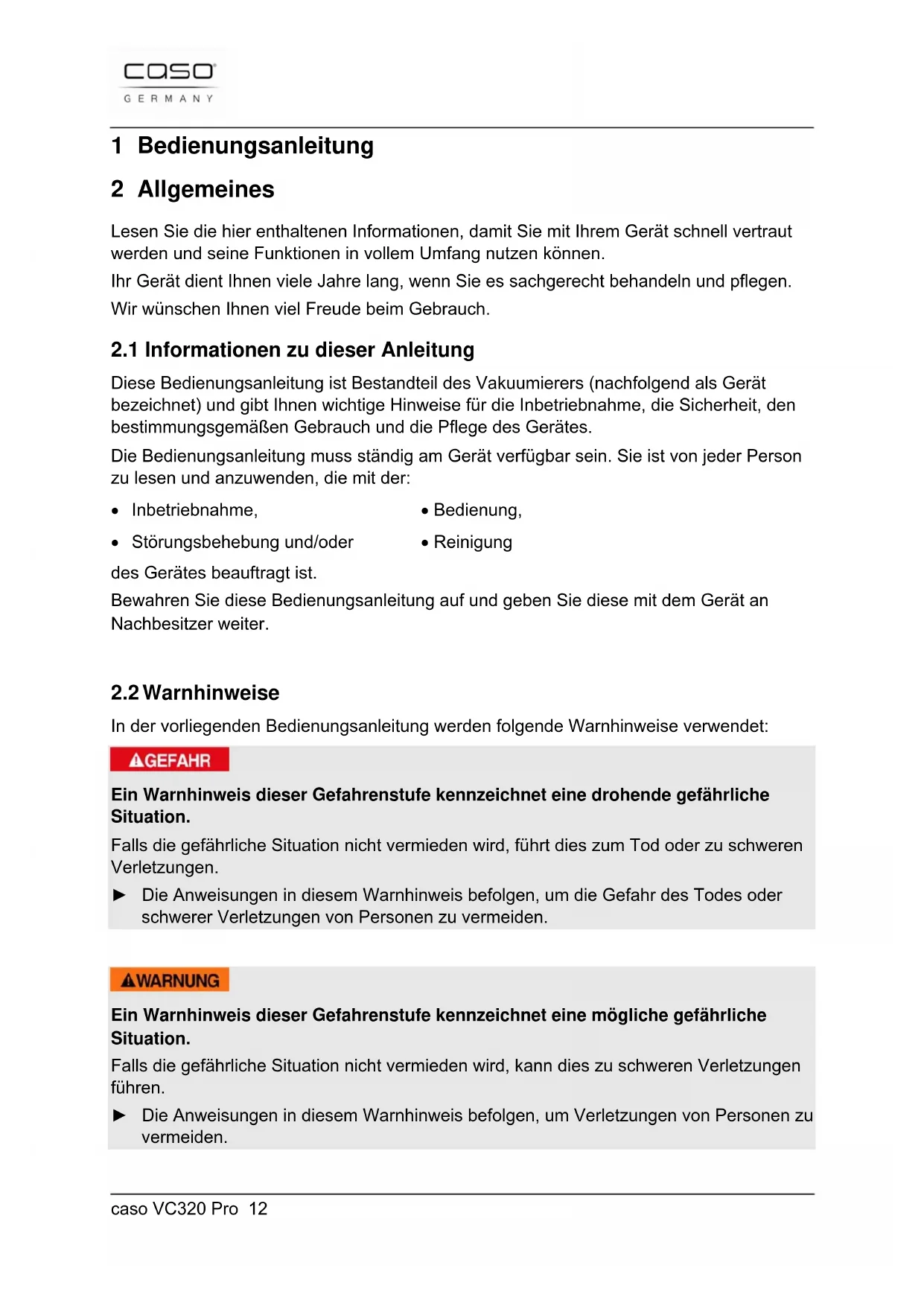 Ein Warnhinweis dieser Gefahrenstufe kennzeichnet eine mögliche gefährliche Situation. Falls die gefährliche Situation nicht vermieden wird, kann dies zu schweren Verletzungen führen. ► Die Anweisungen in diesem Warnhinweis befolgen, um Verletzungen von Personen zu vermeiden.caso VC320 Pro 13