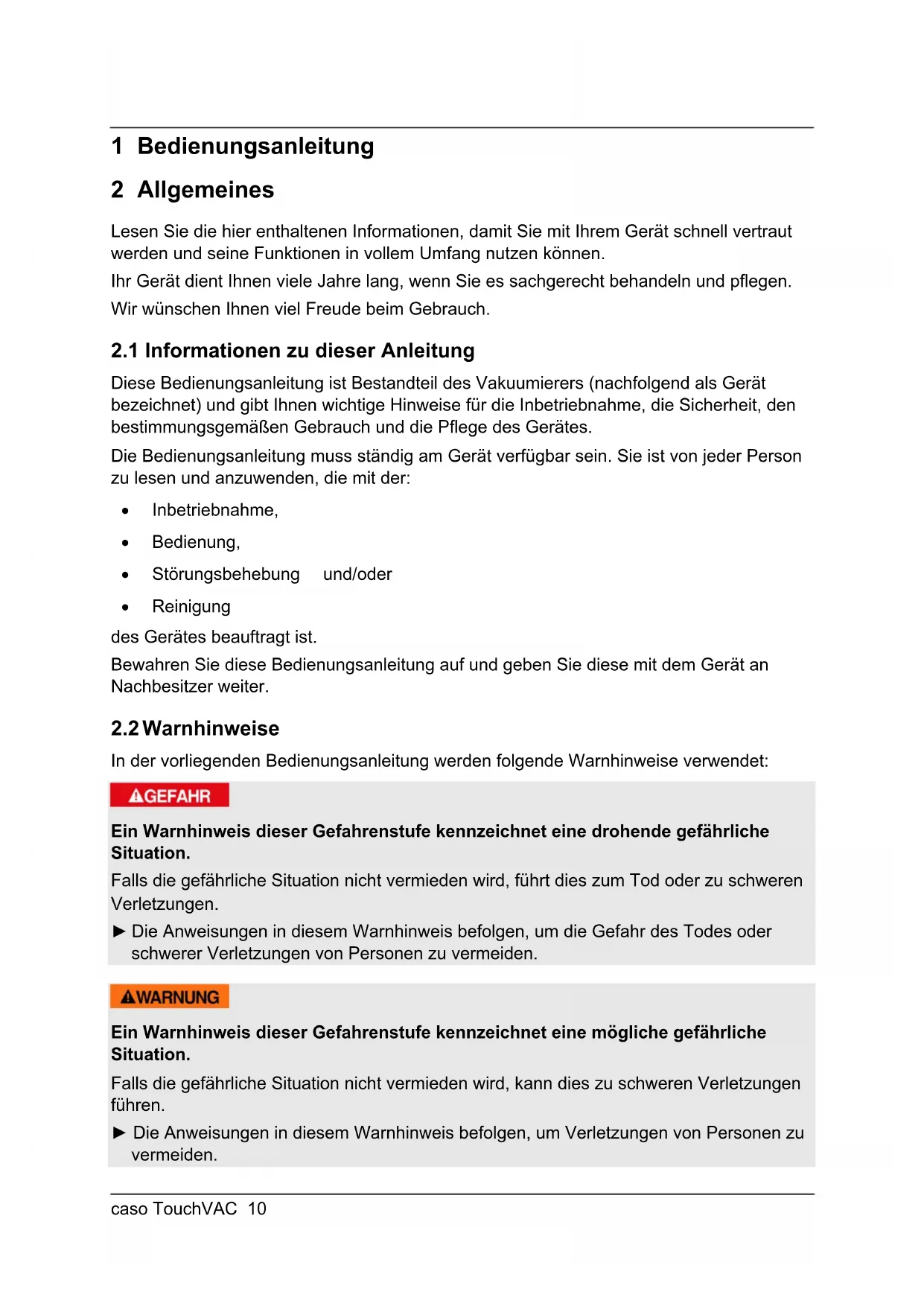 62 Afvoer van het oude apparaat .......................................................................... 115 63 Garantie ........................................................................................................... 115 64 Technische gegevens ....................................................................................... 116caso TouchVAC 10 1 Bedienungsanleitung 2 Allgemeines Lesen Sie die hier enthaltenen Informationen, damit Sie mit Ihrem Gerät schnell vertraut werden und seine Funktionen in vollem Umfang nutzen können. Ihr Gerät dient Ihnen viele Jahre lang, wenn Sie es sachgerecht behandeln und pflegen. Wir wünschen Ihnen viel Freude beim Gebrauch.