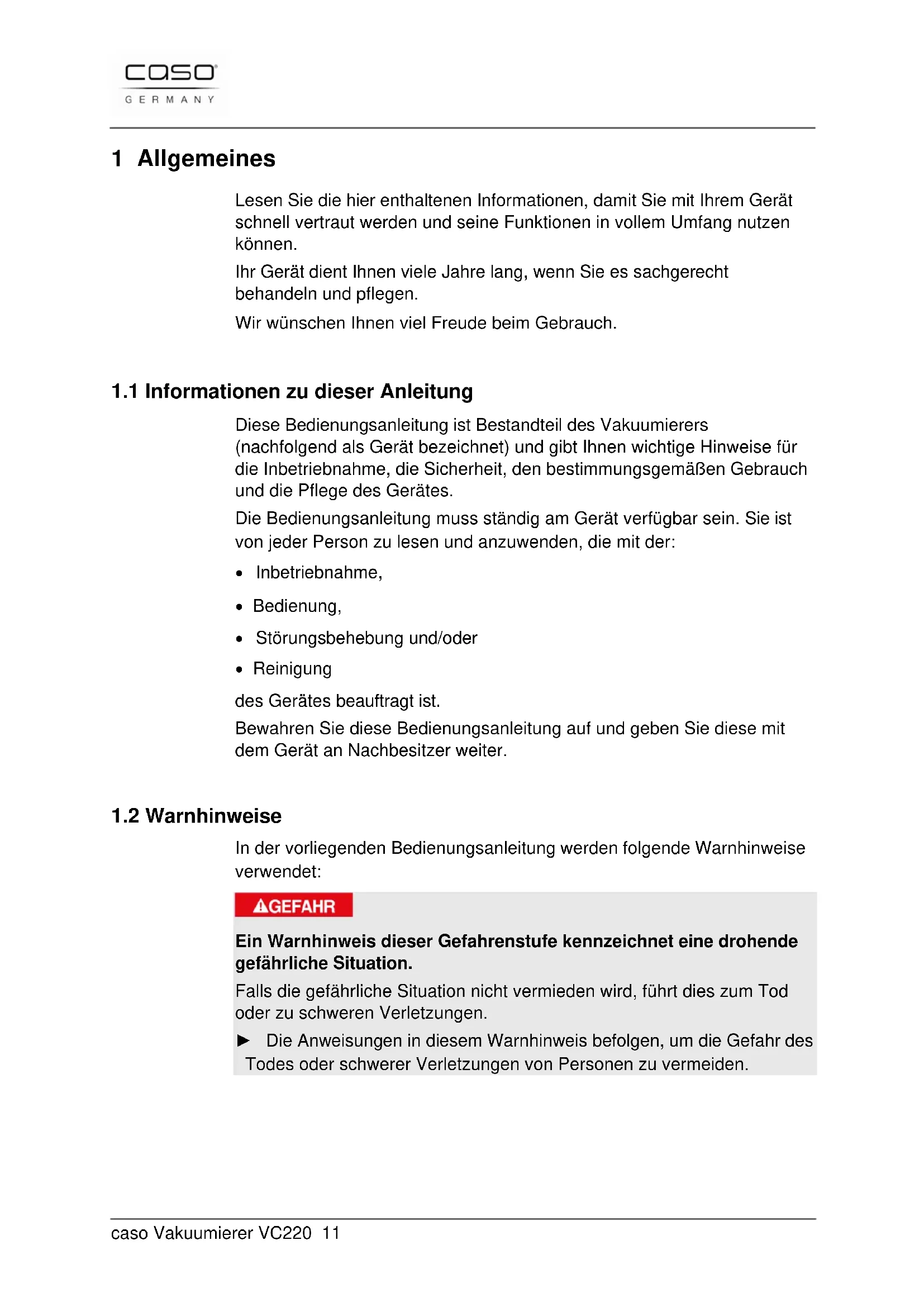 Dokument-Nr.: 1391 15.07.2013 Druck- und Satzfehler vorbehalten. © 2013 Braukmann GmbHcaso Vakuumierer VC220 3 1 Allgemeines ....................................................................... 11