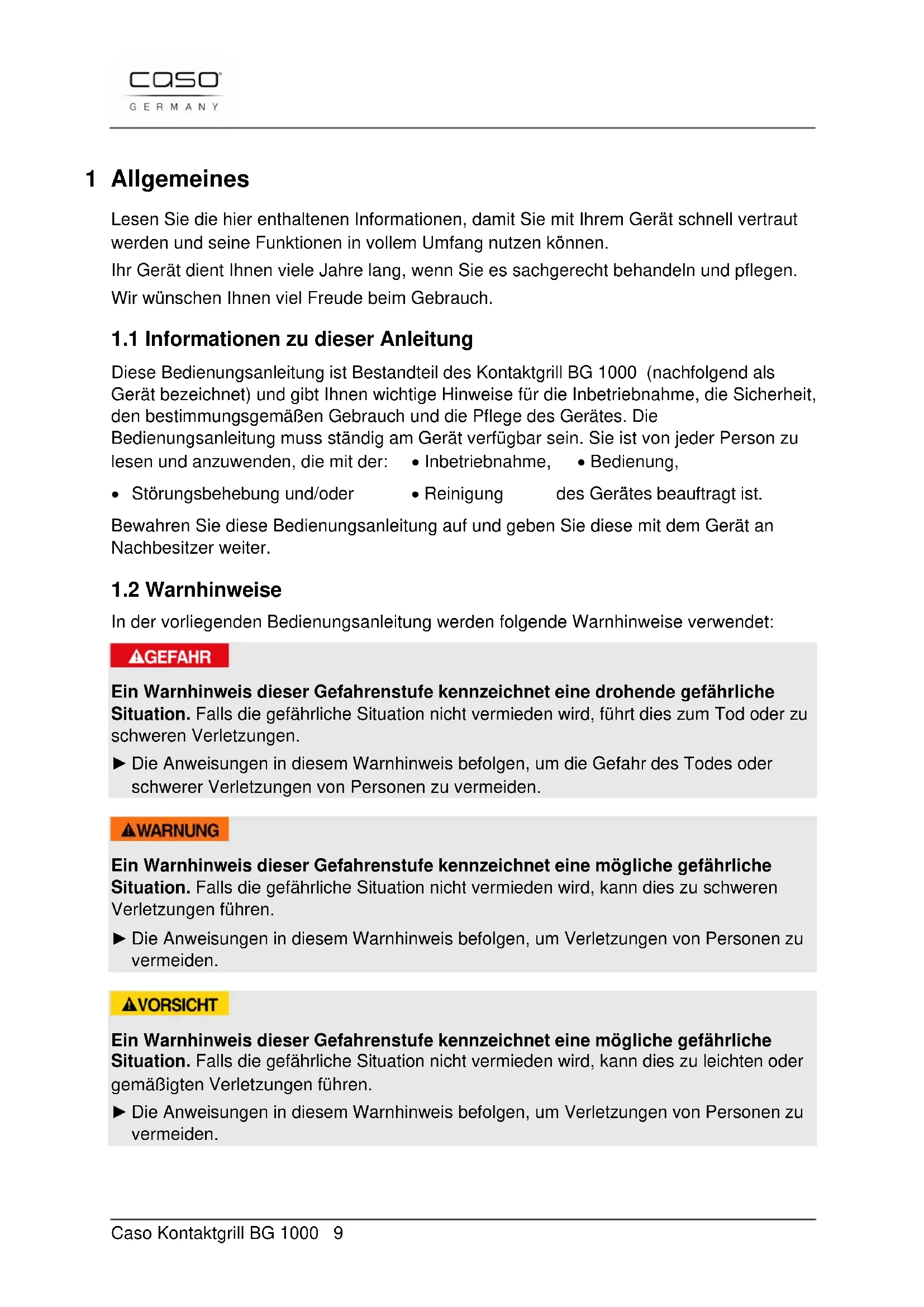 53 Afvoer van het oude apparaat ............................................................ 89 54 Garantie ................................................................................................ 89 55 Technische gegevens ......................................................................... 89Caso Kontaktgrill BG 1000 9 1 Allgemeines Lesen Sie die hier enthaltenen Informationen, damit Sie mit Ihrem Gerät schnell vertraut werden und seine Funktionen in vollem Umfang nutzen können. Ihr Gerät dient Ihnen viele Jahre lang, wenn Sie es sachgerecht behandeln und pflegen. Wir wünschen Ihnen viel Freude beim Gebrauch.