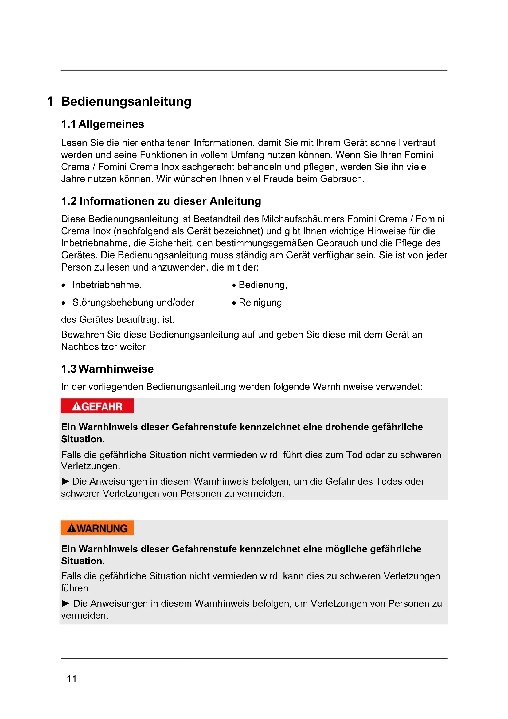 Diese Bedienungsanleitung ist Bestandteil des Milchaufschäumers Fomini Crema / Fomini Crema Inox (nachfolgend als Gerät bezeichnet) und gibt Ihnen wichtige Hinweise für die Inbetriebnahme, die Sicherheit, den bestimmungsgemäßen Gebrauch und die Pflege des Gerätes. Die Bedienungsanleitung muss ständig am Gerät verfügbar sein. Sie ist von jeder Person zu lesen und anzuwenden, die mit der: